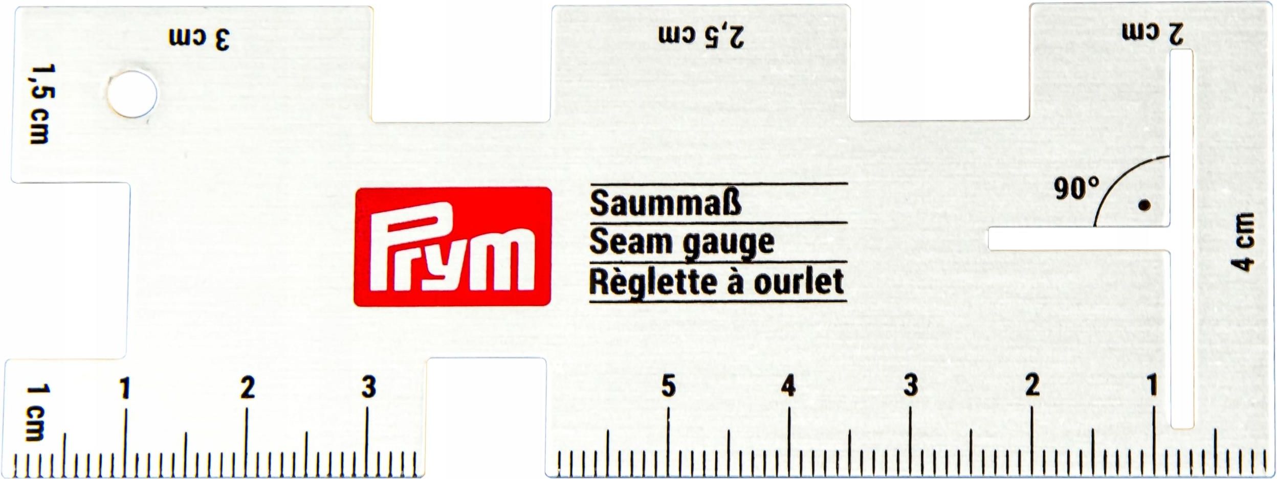 Linijka do szwów Prym Jest to niewielka metalowa linijka służąca do odmierzania zapasów na szwy. Jest to praktyczna pomoc przy odrysowywaniu i krojeniu. Miarką można wygodnie domierzać najczęstsze i typowe szerokości zapasów na szwy czy podłożeń np.: 1 cm 1,5 cm 2 cm 2,5 cm 3 cm 3,5 cm 4 cm 6 cm Na miarce wyznaczony jest również kąt 90°. Cała miarka ma długość 10,5 cm oraz szerokość 4 cm.