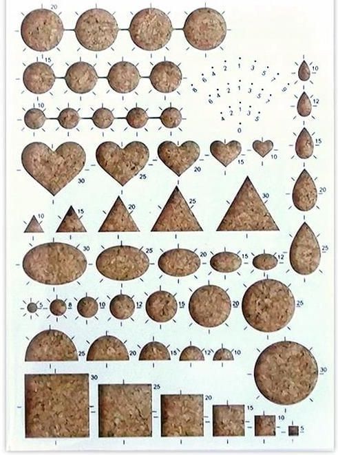 Szablon do quillingu z podstawą z korka różne kształty Szablon posiada 52 otworów o różnych kształtach i różnej wielkości. Jest na podstawie z korka do której można w trakcie pracy przypiąć zwijane paski. Wymiary szablonu: 15 cm x 22 cm. Kolory mogą się nieznacznie różnić, w zależności od ustawień monitora.