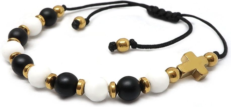 Bransoletka - różaniec na rękę sznurkowy - dziesiątka. Wykonany z 6 mm kamieni agatu mlecznego i matowego onyksu. Dopełnieniem jest złoty hematyt /kuleczki 4mm, krzyżyk 10mm/ Bardzo wygodny w noszeniu - bazą jest cieniutki, ale bardzo mocny sznureczek w kolorze czarnym - rozmiar uniwersalny. podmiot odpowiedzialny: Kolczykarnia Mirosław Chechelski Janowiec 24-123 Oblasy 138, Polska sklep@kolczykarnia.pl Certyfikaty i ostrzeżenie bezpieczeństwa Zawiera drobne elementy, chronić przed dziećmi. Zdejmować do prac domowych, chronić przed kosmetykami i perfumami. Czyścić ściereczką do biżuterii. Przechowywać w osobnych przegódkach.