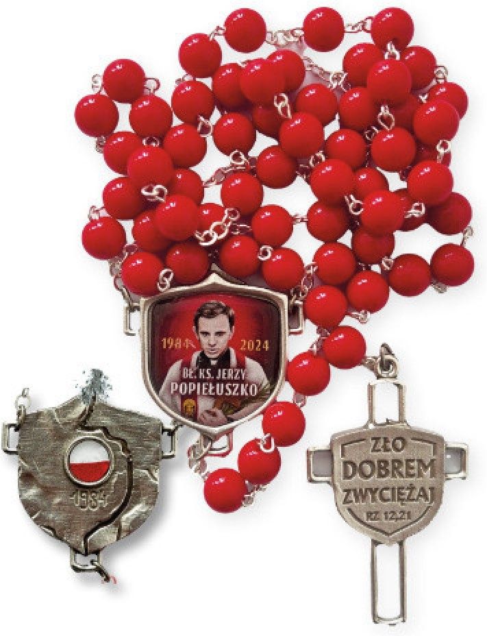Wyjątkowy różaniec zaprojektowany i wykonany ku czci bł. ks. Jerzego Popiełuszki w 40. rocznicę męczeńskiej śmierci. Zarówno medalion w różańcu, jak i wieńczący go krzyżyk zostały zaprojektowane i odlane specjalnie na tę okoliczność. Medalion w różańcu inspirowany tradycyjnymi ryngrafami przypomina jednocześnie kontury Polski. Na awer-sie znajduje się wizerunek ks. Jerzego oraz pamiątkowe inskrypcje. Przestrzenny, surowy rewers przecina żłobienie przypominające rzekę Wisłę. Na pierwszy plan wybija się biało-czerwony mini relikwiarz umieszczony w miejscu mającym symbolizować zaporę na Wiśle we Włocławku, gdzie znaleziono ciało ks. Popiełuszki. W relikwiarzu tym znajdują się drobinki ziemi z pierwszego grobu bł. ks. Jerzego. Koraliki w kolorze intensywnej czerwieni symbolizują męczeństwo ks. Jerzego. podmiot odpowiedzialny: San Gabriele ul. Przemysłowa 19 32-052 Radziszów NIP 9441602804 tel. 782 427 736