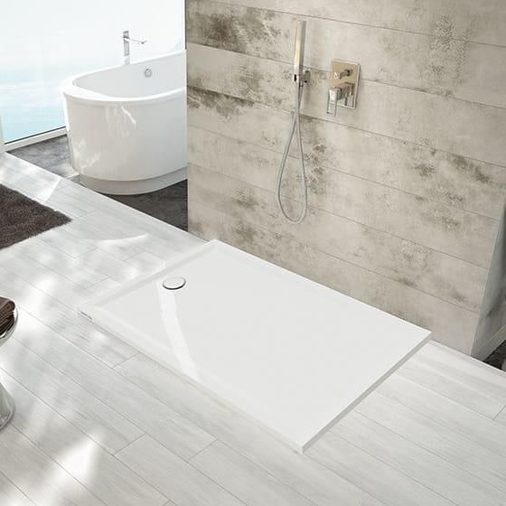 - Dłuższy bok: 150 cm - Krótszy bok: 80 cm - Głębokość: 1.5 cm - Średnica odpływu: 90 mm - Materiał: Z konglomeratu