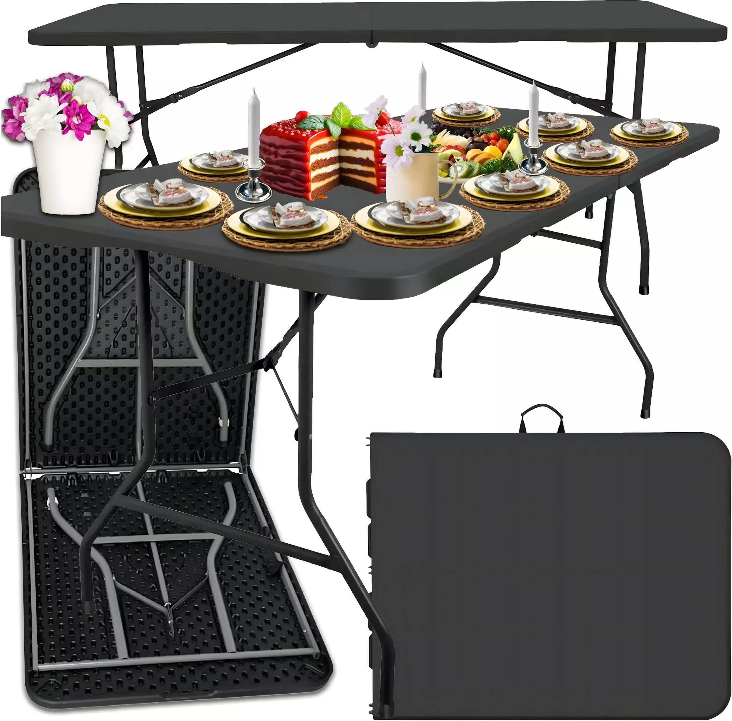 Przedstawiamy stół cateringowy ogrodowy bankietowy składany w walizkę o wymiarach 180 x 74 x 74 cm – idealne rozwiązanie na różnorodne okazje, zarówno w plenerze, jak i wewnątrz pomieszczeń.​ Główne cechy produktu: Solidna konstrukcja: Blat stołu wykonany jest z wytrzymałego polietylenu HDPE, odpornego na promieniowanie UV oraz wilgoć. Stelaż z malowanej proszkowo stali zapewnia stabilność i trwałość. ​ Funkcjonalność składania: Stół można łatwo złożyć do formy walizki, co ułatwia transport i przechowywanie. Po złożeniu zajmuje niewiele miejsca, a wbudowany uchwyt umożliwia wygodne przenoszenie. Wymiary: Blat o długości 180 cm i szerokości 74 cm zapewnia przestrzeń dla 6-8 osób. Wysokość stołu wynosi 74 cm, co gwarantuje komfort użytkowania. ​ Estetyczny design: Neutralny kolor i klasyczny wygląd sprawiają, że stół doskonale komponuje się z różnymi aranżacjami, zarówno podczas bankietów, jak i spotkań rodzinnych w ogrodzie.​ Uniwersalne zastosowanie – idealny na eventy, catering, ogród i biwaki. Wytrzymały – udźwig do 100 kg zapewnia wysoką funkcjonalność. Dzięki swojej wszechstronności i praktyczności, ten stół cateringowy jest niezastąpionym elementem wyposażenia podczas imprez plenerowych, eventów czy codziennego użytku w domu i ogrodzie. 📐 Specyfikacja techniczna: ✔️ Materiał blatu: Polietylen HDPE ✔️ Materiał stelaża: Stal malowana proszkowo, grubość rurek 25*1mm (WZMOCNIONE) ✔️ Waga: 11 kg ✔️ Maksymalne równomierne obciążenie: 100 kg ✔️ Kolor blatu: czarny ✔️ Grubośc blatu: 3,5cm ✔️ Wymiary: 180x74x74 cm ➡️ Zastosowanie składanego stołu cateringowego: 🎉 Eventy i bankiety – idealny na przyjęcia, wesela i uroczystości. 🌳🔥 Imprezy plenerowe – świetny do ogrodu, na pikniki i grille. 🍽️ Branża cateringowa – doskonały do obsługi eventów gastronomicznych. 📊 Targi i konferencje – przydatny na wystawy i prezentacje. 🏡 Domowe przyjęcia – sprawdzi się jako dodatkowy stół dla gości. ⛺ Kempingi i biwaki – wygodny w podróży i odporny na warunki atmosferyczne. 🛠️ Warsztaty i szkolenia – stabilna powierzchnia do pracy i prezentacji.