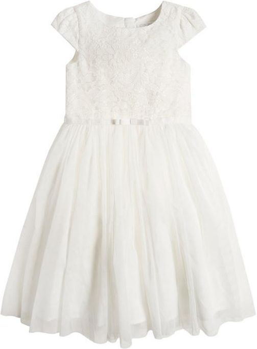 Sukienka z krótkim rękawem dla dziewczynki: - z tyłu zapięcie na suwak Materiał i technologie: - koronka - 100% poliester - tiul - 100% poliester - satynowa podszewka - 100% poliester Pranie i pielęgnacja: - Prać w temperaturze do 30 °C, proces łagodny. - Nie bielić. - Nie suszyć w suszarce bębnowej. - Prasować w temperaturze do 110 °C. - Nie czyścić chemicznie. - Prać i prasować po lewej stronie. - Nie prasować ozdób. - Prać z podobnymi kolorami. - Trzymać z dala od ognia.