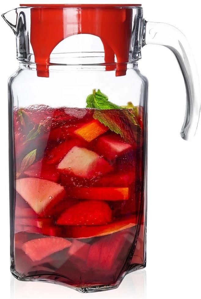 Dzbanek szklany z pokrywką 1,75 l Uniwersalny, szklany dzbanek do napojów. Idealnie sprawdzi się do wody, serwowania soków, lemoniady, herbaty mrożonej, kompotu itp. Posiada pokrywkę, dzióbek oraz wygodny uchwyt. Kod id : 13358 Materiał : szkło Wysokość: 23,5 cm Średnica: 12 cm Pojemność: 1,75 l Waga (g): 1380 Kolor dominujący: przezroczysty SZKLANY - Dzbanek do napojów wykonany z wysokiej jakości szkła w przezroczystym kolorze. Dzbanek ma pojemność 1,75 litra oraz wymiary: 23,5 x 12 cm. WYGODNY - Posiada wygodny uchwyt ułatwiający nalewanie i przenoszenie. Wyprofilowany dzióbek ułatwia nalewanie. ZAMYKANY - Wyposażony w pokrywkę wykonaną z tworzywa w czerwonym kolorze. Pokrywka chroni napój np. przed owadami. UNIWERSALNY - Dzbanek idealnie sprawdzi się do serwowania wody, soków, lemoniady, herbaty mrożonej, kompotu itp. Idealny podczas rodzinnych posiłków, pikniku na działce lub w trakcie imprez ze znajomymi. Dzbanek możemy przechowywać w chłodziarce. Nadaje się do mycia w zmywarce do naczyń. Możemy wlewać do niego napoje o temperaturze maksymalnie 60°C. DEKORACYJNY - Dzbanek pięknie prezentuje się na stole. Idealnie pasuje do każdej zastawy. Posiada klasyczny kształt, dzięki czemu stanowi element dekoracyjny. Szklany dzbanek do napojów. Wygodny w użytkowaniu. Dzięki wyprofilowanemu dzióbkowi, nalewanie jest wyjątkowo proste. Dzbanek świetnie sprawdzi się do serwowania różnych napojów. Prezentuje się bardzo efektownie i pasuje do każdej zastawy stołowej. Wyprodukowano zgodnie z europejskimi standardami.