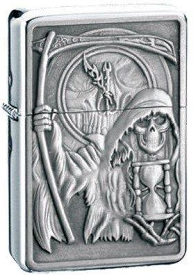 Zapalniczka benzynowa z serii TASMAN (stalowa), kolor srebrny błyszczący ze srebrnym emblematem. Motyw - śmierć z kosą. Opakowanie jednostkowe - kartonowe pudełko. Zapalniczka posiada wieczystą gwarancję na działanie. Zapalniczka nie jest napełniona benzyną. W komplecie znajduje się foliowa torebka prezentowa, z logo serii Tasman.