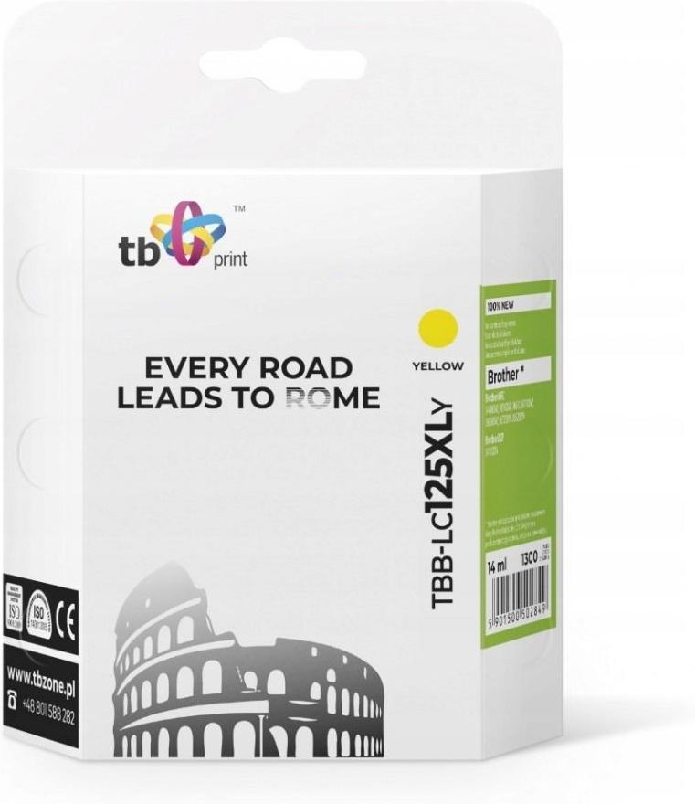 TB PRINT Tusz do Brother LC125XL TBB-LC125XLY YE Rodzaj wkładu: Tusz Kolor: Żółty (yellow) Pojemność: 14 ml Wydajność (5% pokrycie): 1300 str. A4 Chip: Tak Liczba w opakowaniu jednostkowym: 1 Kompatybilność: MFC-J4410DW/J4510DW/J4610/J4710DW/J6920DW/J6720DW/J6520DW/DCP-J4110DW/ Kod oryginału: …