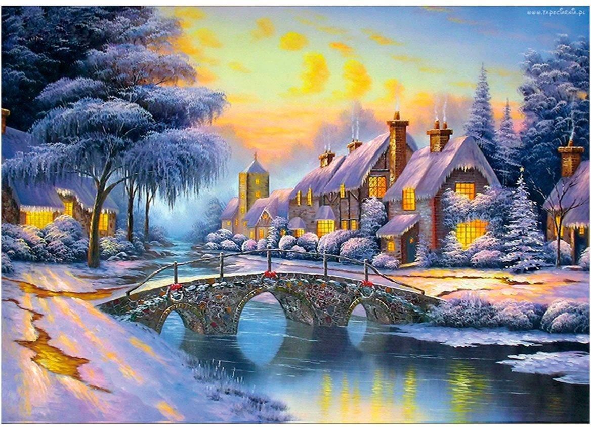 Mozaika diamentowa, haft 30x40 Zima - domek i most Flamingo line Mozaika diamentowa to inaczej haft diamentowy - polega na wyklejeniu obrazu według szablonu na płótnie przy użyciu kolorowych diamencików. W zestawie znajduje się 1 obraz, diamenciki oraz niezbędne akcesoria.