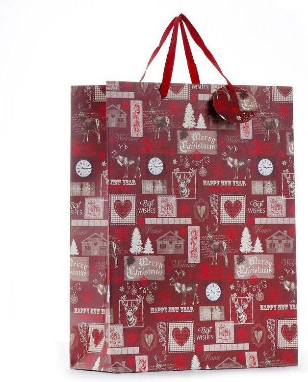 - torba prezentowa - wzór: świąteczna, serca, renifery, napisy - uszy z tasiemki - wymiary: 40 x 30 x 12 cm