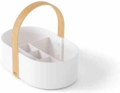 Umbra - Organizer M z uchwytem biały/natural, BELLWO Organizer Umbra Bellwood - wielofunkcyjny pojemnik np. na kosmetyki, przybory do makijażu, akcesoria biurowe, - wykonany z tworzywa sztucznego ABS oraz drewna (topola i jesion), - ma modne, zaokrąglone kształty, - łatwy do przenoszenia dzięki uchwytowi w formie wygodnego ucha, - wewnątrz wyjmowana przegródka, - na spodzie gumowe nóżki chroniące przed porysowaniem mebli, - uniwersalny design odpowiedni do wielu wnętrz, - należy czyścić ręcznie. Wymiary: 32 x 20 x 23cm (dł. x szer. x wys.) Materiał: tworzywo sztuczne, drewno Kolor: biały, beż Kolekcja: Bellwood Designer: Sung Wook Park