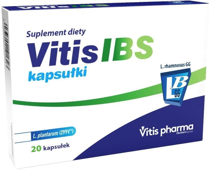 Vitis IBS, wsparcie dla osób z zespołem jelita drażliwego, 20 kapsułek RODZAJ REJESTRACJI: Suplement diety PRODUCENT: Dicofarm Polska ADRES PRODUCENTA: ul. Giełdowa 7/9, 01-211 Warszawa ILOŚĆ: 20 kapsułek OPIS Vitis IBS to suplement diety zawierający żywe kultury bakterii probiotycznych. Produkt ten jest dedykowany osobom pragnącym wspierać równowagę mikroflory jelitowej, szczególnie w kontekście zespołu jelita drażliwego (IBS). Składniki aktywne: Lactobacillus rhamnosus GG – jeden z najlepiej przebadanych szczepów probiotycznych, znany ze swojej odporności na działanie kwasu żołądkowego i zdolności do kolonizacji jelit. Lactobacillus plantarum 299V® – szczep o udokumentowanej skuteczności w łagodzeniu objawów IBS, takich jak wzdęcia, bóle brzucha czy nieregularne wypróżnienia. Kiedy warto stosować Vitis IBS: Masz nawracające bóle brzucha, skurcze, uczucie przelewania się w jelitach Cierpisz na wzdęcia, gazy lub uczucie pełności po jedzeniu Masz zaparcia, biegunkę lub naprzemienne wypróżnienia Odczuwasz dyskomfort jelitowy związany ze stresem lub dietą Jesteś w trakcie lub po antybiotykoterapii (aby odbudować florę bakteryjną jelit) Chcesz poprawić równowagę mikroflory jelitowej SPOSÓB UŻYCIA 1 kapsułka dziennie. Kapsułkę połknąć w całości lub otworzyć i zawartość rozpuścić w 20 ml (minimalna objętość) ciepłej wody (do 37°C) lub innego płynu (np. sok owocowy, mleko). Można go przyjmować o każdej porze dnia. OSTRZEŻENIA Nie należy przekraczać zalecanej porcji do spożycia w ciągu dnia. Suplement diety nie może być stosowany jako substytut zróżnicowanej diety. Dla zachowania dobrego stanu zdrowia ważne jest stosowanie zbilansowanej diety oraz prowadzenie zdrowego trybu życia. Nie stosować w przypadku nadwrażliwości na którykolwiek ze składników preparatu. Przechowywać w suchym miejscu. Chronić od światła i wilgoci. Przechowywać w temperaturze nie przekraczającej 25°C. Przechowywać w sposób niedostępny dla małych dzieci. SKŁADNIKI Maltodekstryna, substancja glazurująca: hydroksypropylometyloceluloza (kapsułka), L. rhamnosus GG, L. plantarum (299V®)**; substancja przeciwzbrylająca: E 470b. **299V® jest zastrzeżonym znakiem towarowym firmy Probi AB. Składnik Dzienna porcja do spożycia (1 kapsułka) L. rhamnosus GG 1x10¹⁰ CFU* L. plantarum (299V®) 1x10¹⁰ CFU* *CFU – jednostka tworząca kolonię bakterii.