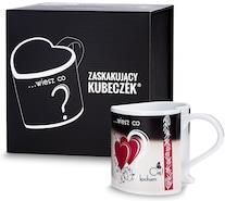Zaskakujący Kubeczek w pudełku Kocham Cię magiczny GAD02789 Magiczny kubek zmieniający kolor Zaskakujący Kubeczek Deluxe to termoaktywny kubek w kształcie serca z ukrytą wiadomością, zapakowany w eleganckie pudełko prezentowe. Na pierwszy rzut oka, wszystko, co na nim widać, to pytanie Wiesz co? umieszczone na czarnym tle. Kiedy wlejesz do kubka gorący napój, jego wygląd całkowicie się zmieni. Czarna farba stopniowo zaniknie, odsłaniając serca i napis Kocham Cię. Nie tylko na Walentynki Chociaż ten prezent w szczególności sprawdzi się podczas Dnia Zakochanych czy rocznicy, każdy inny dzień jest równie dobry, by powiedzieć komuś "kocham Cię". Miłosny kubeczek zmieniający wygląd, ukryty w czarnym pudełku prezentowym, idealnie nadaje się też na prezent bez okazji, zarówno dla niej, jak i dla niego. Zaskakująca wiadomość w takiej formie rozbudzi uczucia i rozjaśni każdy dzień kochanej osoby. Wyraź uczucia przez zaskoczenie Najlepszym sposobem na wyrażenie swoich uczuć jest zrobienie tego przez zaskoczenie. Taki czuły gest zrobi wrażenie na ukochanej osobie i zostanie zapamiętany, a każda kawa lub herbata będzie się jej z Tobą kojarzyć. Kubeczek zapakowany jest w eleganckie pudełko prezentowe, więc już przed otwarciem rozbudza wyobraźnię. Jeśli chcesz zrobić przyjemność także sobie, pusty kubeczek zalej gorącym napojem na oczach drugiej połówki i obserwuj jej reakcję. Jak to działa Kubek został pokryty specjalną farbą, która - gdy kubeczek jest gorący - stopniowo odkrywa ukrytą wiadomość. Jeśli chcesz zrobić komuś niespodziankę, wystarczy, że wlejesz do niego gorący napój. Gdy ostudzisz kubek, serce i napis stopniowo zanikną. Ten gadżet to wymarzony prezent dla dziewczyny - skrywa w sobie tajemnicę, jest uroczy, odwołuje się do uczuć, a do tego jest ładnie zapakowany. Magiczny kubek: dzięki specjalnej farbie nadruk na kubku zmienia wygląd pod wpływem ciepła. Po wystygnięciu lub zalaniu zimną wodą wraca do stanu początkowego.W przeciwieństwie do innych termoczułych kubków, ten kubek zmienia wygląd na całej powierzchni.Nadruk wokół całego produktu. Gotowy do wręczenia na prezent bez konieczności dodatkowego pakowania. Napis na produkcie: Wiesz co? Kocham Cię! Produkt w polskiej wersji językowej.Materiał: porcelana. Wymiary: 8,5 cm (wysokość), 300 ml (pojemność). Produkt zapakowany w pudełko prezentowe z maganetycznym zapięciem. Nie myć w zmywarce. Nie używać w mikrofalówce. Nadaje się do kontaktu z żywnością. Umyj przed pierwszym użyciem.Produkt jest chroniony zarejestrowanym znakiem towarowym.Produkt bezpieczny posiada świadectwo sanepidu.Wymiary w opakowaniu: 13,5 x 15,0 x 15,3 (cm).Waga: 0,56 kg.