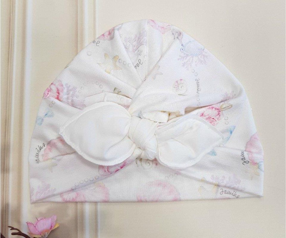 Jamiks turban na wiosnę dla dziewczynki wiskoza kokarda róże ecru. Delikatna pastelowa czapka na wiosnę dla małej dziewczynki, wykonana z podwójnej malowanej dzianiny wiskozowej. Turban jest podwójny – aby był troszkę grubszy, sztywniejszy i lepiej
