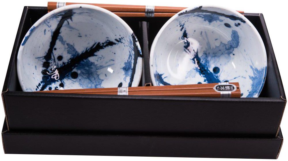 Made in Japan - Zestaw 2 miseczek Splash Zestaw dwóch miseczek wykonanych z ceramiki w delikatnym błękitnym kolorze z oryginalnym wzorem przypominającym przypadkowe kleksy farby. Naczynia marki Made in Japan są produkowane ręcznie, z zachowaniem tradycyjnych japońskich procedur rzemieślniczych. Wzory na wyrobach są malowane lub nakładane metodą kalkowania. Wszystkie naczynia posiadają przepiękne i zarazem oryginalne wzornictwo czyniąc je wyjątkowymi wśród ogromu kuchennych naczyń wykorzystywanych na co dzień. Symbolizują połączenie trwałości i klasyki z nowoczesnym nurtem. Dzięki wykonaniu z dbałością o szczegóły stanowią naczynia określane mianem ekskluzywnych. Miseczki mają pojemność 400 ml oraz wymiary 15 cm x 7 cm. W zestawie znajdują się dwie pary pałeczek o długości 23 cm. Miski można używać w kuchence mikrofalowej oraz myć w zmywarce. Całość zapakowana w czarne, eleganckie pudełko - idealny prezent na różne okazje.