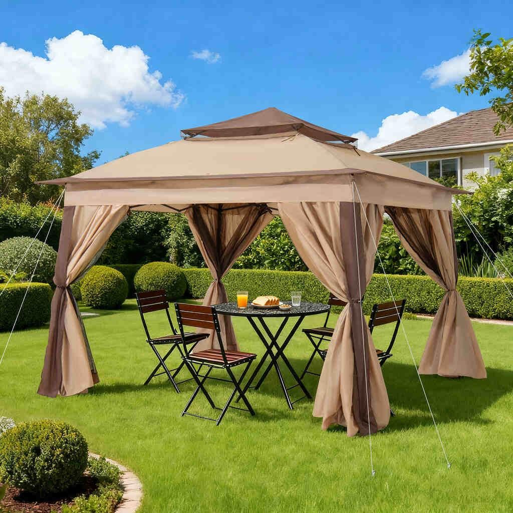 Pawilon ogrodowy Sunjoy POP UP o wymiarach 3,3x3,3 m w kolorze beżowym z moskitierami i zasłonami UWAGA: Przedsprzedaż - wysyłka pawilonu odbędzie się na koniec lutego- początek marca 2026. Pawilon ogrodowy beżowy 330×330 cm z moskitierą i zasłonami — wodoodporny, wentylowany dach, UV 50+ Stwórz …