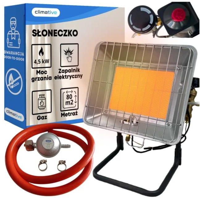 Promiennik gazowy słoneczko Climative IRG-45S 4,5 kw zapalnik PIEZO reduktor 4500W lekka mobilna ze stojakiem do 80m2 na butle gazową propan-butan Pyrzyce
