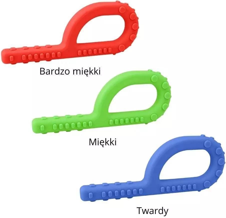 Dla kogo? Progresywny zestaw gryzaków z wypustkami Grabber to komplet przeznaczony dla dzieci już od 5-6 miesiąca życia. W skład zestawu wchodzą 3 gryzaki o różnych stopniach twardości. Wszystkie z nich mają specjalne wypustki, które dodatkowo stymulują sensorycznie malucha i wspierają prawidłowy rozwój propriocepcji. Pierwszy z gryzaków (Grabber z Wypustkami ‒ Bardzo Miękki) jest przystosowany do najdelikatniejszych dziąseł. Mogą z niego korzystać niemowlęta, zarówno podczas ząbkowania, jak i w przygotowaniu do gryzienia pokarmów i mówienia. Drugi gryzak (Grabber z Wypustkami ‒ Miękki) jest nieco twardszy od poprzedniej wersji. Może być on stosowany jako kolejny stopień progresji lub stanowić różnorodne bodźcowanie, w zależności od potrzeb malucha. Gdy dziecko już samodzielnie nauczy się gryźć, a opór poprzednich gryzaków jest z dużą łatwością pokonywany, następuje moment, w którym warto wprowadzić trzeci z kolei gryzak. Dostępny w zestawie Gryzak Grabber z Wypustkami ‒ Twardy dostarczy dziecku mocniejszych bodźców, dzięki czemu ćwiczenia mięśni wykorzystywanych w czasie mówienia i spożywania pokarmów będą nadal efektywne. Pomoże to maluchom jedzącym już samodzielnie, ale też mającym problemy z wymową. Tak skomponowany zestaw gryzaków będzie więc pomocny dla niemowlaków, ale też dla dzieci do wieku 2,5 lat. Komplet przyda się także logopedom, gdyż pozwoli dopasować stopień twardości do potrzeb każdej terapii. Dlaczego warto? Wzmocnienie mięśni okolicy ust ‒ pomoc w nauce gryzienia Progresywny zestaw gryzaków pozwoli na bieżąco dobierać odpowiedni opór w czasie ćwiczeń mięśni orofacjalnych. To ważne, gdyż tak jak w każdych ćwiczeniach, wraz ze stopniowym wzmacnianiem mięśni będzie potrzebny kolejny stopień trudności. Idealny na początku gryzak bardzo miękki dostarczy maluchowi pierwszych bodźców związanych z oporem do pokonania. Obserwując, czy nadal dziecko efektywnie angażuje w czasie gryzienia mięśnie twarzy, można dobierać kolejny gryzak, tym razem już twardszy. Pozwoli to wzmocnić aparat żucia i gryzienia, co ułatwi przyjmowanie pokarmów stałych. Sprawniejszy rozwój mowy Dzięki gryzakom dziecko wzmacnia także mięśnie biorące udział w procesie mówienia. Odpowiednie napięcie okolicy odpowiedzialnej za wypowiadanie głosek jest konieczne, aby mowa była prawidłowa i wyraźna. Gryzaki mogą bardzo pomóc w przygotowaniu do mówienia. Zawarty w zestawie progresywnym gryzak twardy będzie również dużą pomocą w czasie ćwiczeń logopedycznych u dzieci starszych, mających wady wymowy. Zestaw w szczególności przyda się maluchom z obniżonym napięciem mięśniowym i sprawi, że osłabione okolice będą stopniowo odzyskiwać prawidłową funkcję. Ulga podczas ząbkowania Komplet gryzaków jest bardzo przydatny, gdy niemowlę ząbkuje. Każdy rodzic szuka w tym czasie sposobu, jak ulżyć maluszkowi mającemu nabrzmiałe i bolesne dziąsła. Jedną z metod pozwalających zmniejszyć dolegliwości związane z pojawianiem się pierwszych ząbków jest używanie gryzaka. Zawarte w zestawie gryzaki pozwolą masować dziąsła aż do okolicy zębów trzonowych. Wygodny uchwyt sprawi, że ząbkujący maluch będzie mógł z łatwością samodzielnie sięgać po gryzak. Stymulacja proprioceptywna dzięki specjalnym wypustkom Wypustki znajdujące się na gryzakach Grabber z zestawu progresywnego dostarczają dziecku bodźców sensomotorycznych. Jest to przydatne nie tylko na etapie ząbkowania, ale też w czasie kształtowania się prawidłowej integracji sensorycznej. Progresywny zestaw gryzaków ‒ pomoc na różnych etapach rozwoju Mając pod ręką zestaw gryzaków o różnych stopniach twardości, będzie można na bieżąco dobierać model do aktualnych potrzeb malucha. Wraz ze wzrostem siły mięśni aparatu żucia i gryzienia w zasięgu ręki będą gryzaki o kolejnych stopniach twardości. Na późniejszych etapach można również przeplatać korzystanie z różnych gryzaków, aby rozwijać u dziecka zdolności percepcyjne. Odmienne bodźce uczą malucha je różnicować, co jest dodatkową korzyścią posiadania całego zestawu. Bezpieczne materiały, dobra jakość i atrakcyjna cena kompletu Materiały, z których został wykonany zestaw gryzaków to tworzywa klasy medycznej. Gryzaki nie zawierają lateksu, FDA, ołowiu i innych szkodliwych składników. Bezpieczeństwo stosowania, dobra cena i jakość sprawiają, że warto mieć cały zestaw w domu i w gabinecie. Co zawiera? 3 gryzaki: Gryzak Grabber z Wypustkami ‒ Bardzo Miękki Gryzak Grabber z Wypustkami ‒ Miękki Gryzak Grabber z Wypustkami ‒ Twardy Poszczególne produkty wchodzące w skład pakietu są wyszczególniane jako osobne pozycje na fakturze VAT. Główne informacje Materiał: tworzywo klasy medycznej Wymiary: Gryzak Grabber z Wypustkami ‒ Bardzo Miękki: średnica pętli: 5,1 cm, długość: 10,2 cm, grubość: 1,1 cm Gryzak Grabber z Wypustkami ‒ Miękki: średnica pętli: do 5 cm, długość: 12,7 cm, szerokość: 1,2 cm Gryzak Grabber z Wypustkami ‒ Twardy: średnica pętli: d