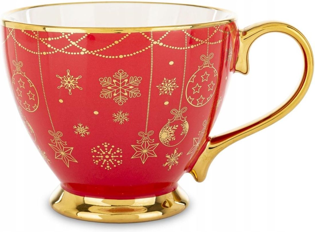 Świąteczny kubek porcelanowy 380 ml – czerwony ze złotymi dodatkami i motywem śnieżek i świątecznych bombek❄️ 182118 Stwórz bajkową atmosferę świąt dzięki eleganckiemu kubkowi porcelanowemu o pojemności 380 ml. To nie tylko praktyczny element codziennych rytuałów, ale także wyjątkowa ozdoba, która …