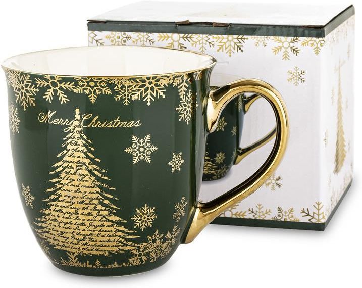 Kubek Świąteczny Zielony porcelana 560 ml Na Prezent Boże Narodzenie Wprowadź magię świąt do swojej codzienności! Elegancki porcelanowy kubek w głębokim zielonym kolorze ozdobiony złotymi śnieżynkami i sylwetką renifera to doskonały sposób na celebrację zimowych chwil. Cechy produktu: Pojemność: 560 ml – idealny na herbatę, kakao lub grzane wino Kolor: głęboka zieleń z detalami w połyskującym złocie Motyw: świąteczny renifer w otoczeniu śnieżynek, napis Merry Christmas Rant oraz uchwyt w kolorze metalicznego złota – nadają wyjątkowego blasku Materiał: wysokiej jakości porcelana Specyfikacja Rozmiar: 11 x 15 x 11,5 cm Waga: 0,48 kg Zapakowany w ozdobne pudełko – idealny na prezent Nie nadaje się do mycia w zmywarce Nie używać w kuchence mikrofalowej – złote elementy są metalizowane Idealny prezent pod choinkę – stylowy, praktyczny i pełen świątecznego uroku!