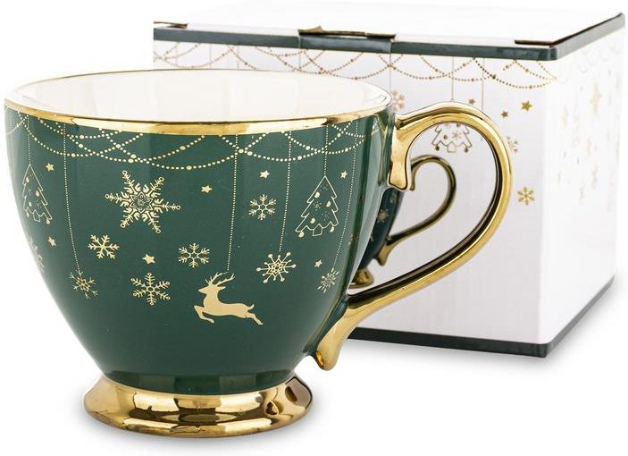 Świąteczny Kubek 380 ml – Butelkowa Zieleń ze Złotymi Dodatkami i Eleganckimi Śnieżkami � 182117 Rozgrzej zimowe dni aromatyczną kawą, herbatą lub gorącą czekoladą w naszym kubku świątecznym o pojemności 380 ml! 🌟 Elegancki design i świąteczne motywy sprawiają, że kubek będzie idealnym dodatkiem do każdej zimowej aranżacji. 🔶 Wyjątkowy design: Kubek w klasycznej butelkowej zieleni z białymi i złotymi akcentami ❄️✨. Motyw eleganckich śnieżek nadaje mu subtelnego, świątecznego uroku, który wprowadzi ciepłą i przytulną atmosferę w Twoim domu. 📏 Wymiary: Wysokość: 9 cm Szerokość: 14 cm Głębokość: 11 cm Lekki i praktyczny: Kubek waży 0,43 kg, co czyni go wygodnym w codziennym użyciu i łatwym do przenoszenia. 🎨 Kolory i styl: Połączenie bieli i złota z eleganckim zielonym tłem nadaje kubkowi szyku i sprawia, że doskonale pasuje do świątecznych stołów i zimowych dekoracji. 🌿 Informacje dodatkowe: Pojemność: 380 ml – idealny na standardowy napój Materiał: porcelana Nieodpowiedni do zmywarki i mikrofalówki ❌ Wprowadź świąteczny klimat do swojego domu z naszym kubkiem świątecznym 380 ml w butelkowej zieleni ze złotymi śnieżkami i ciesz się ciepłem zimowych chwil przy ulubionym napoju!