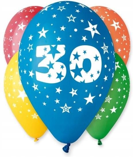 BALONY CYFRA 30, PASTELOWE 12" Rozmiar w calach: 12" Rozmiar w centymetrach: ok. 30 cm Kolor: wielokolorowy Nadruk: białe, ozdobne gwiazdki Ilość sztuk w opakowaniu: 5 Producent: Gemar Wyprodukowano dla: GoDan Uwaga: balon pakowany maszynowo, ilości sztuk z danego koloru występują w różnych proporcjach Idelane na każdą okazję Nadają szyku i elegancji przyjęciom i uroczystościom