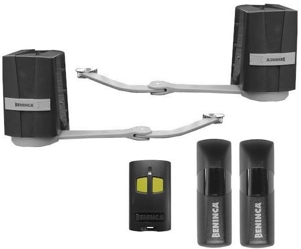 Zestaw BENINCA KBN24.PM przeznaczony jest do automatyzacji pracy bram skrzydłowych z raminiem łamanym 1 x Siłownik z wbudowaną centralą i odbiornikiem radiowym "BN.E24" 1 x SIłownik 24Vdc "BN.24" 2 x Ramię przegłubowe "BA" 1 x Para fotokomórek synchronizacyjnych "PUPILA" 1 x Pilot 2 kanałowy "TO.GO2A" Opis poszczególnych elementów zestawu: - Siłownik z wbudowaną centralą i odbiornikiem radiowym "BN.E24" Nienawrotny siłownik elektromechaniczny na napięcie 24Vdc do użytku intensywnego. Odpowiedni do szerokich słupków. Możliwość podłączenia urządzenia odblokowującego pozwalającego na odblokowanie napędu z zewnątrz posesji (w przypadku zaniku napięcia). Wyposażony w mechaniczny wyłącznik krańcowy na otwieraniu. Amperometryczny system wykrywania przeszkody zabezpiecza przed zgnieceniem. Możliwość zasilania akumulatorowego. Specyfikacja techniczna: Parametry Techniczne BN.E24 Zasilanie 230 Vac (50-60 Hz) Zasilanie silnika 24 Vdc Natężenie 0.76 A Maksmalna siła 125 Nm Czas otwarcia 10" Cykl pracy Użycie intenstywne Stopień ochrony IP44 Ogarnicznik mechaniczny Na otwieraniu Wbudowana centrala sterująca TAK Temperatura pracy -20C/+50C Długość skrzydła 2.1m Waga 7.9kg - Siłownik na napięcie 24 Vdc. "BN.24" Siłownik na napięcie 24 Vdc. - Ramię przegłubowe "BA" Ramię przegubowe. - Para fotokomórek synchronizacyjnych "PUPILA" 24V/dc do montażu natynkowego, kąt regulacji 180°. (110X36X31mm). Istnieje możliwość synchronizacji do 4 par fotokomórek. Dioda LED ułatwia i przyspiesza centrowanie promienia. - Pilot 2 kanałowy "TO.GO2A" 433,92MHz pilot 2 lub 4- kanałowy, kod zmienny. Kod ARC.