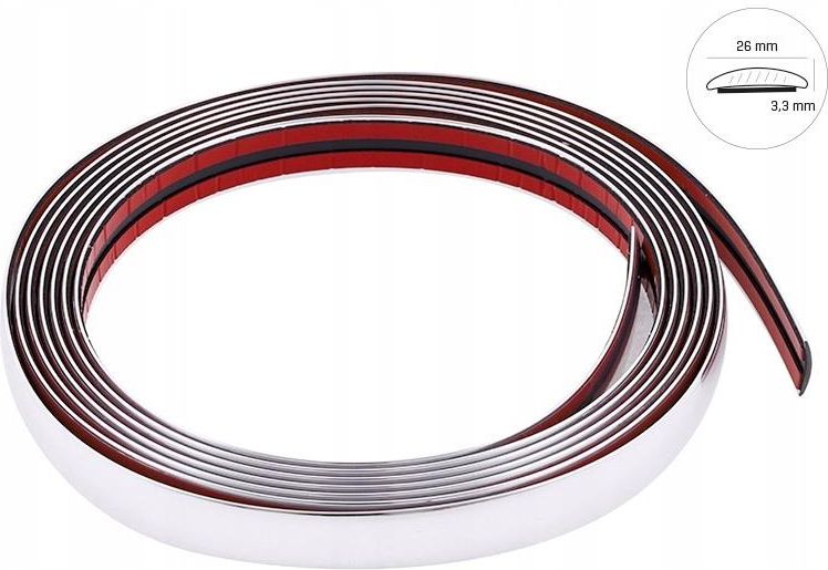 LISTWA / TAŚMA CARMOTION OZDOBNA / DEKORACYJNA / OCHRONNA CHROM Szerokość : 26 mm Grubość : 3.3 mm Długość : 5 metrów (nr katalogowy 63770) Elastyczna listwa dekoracyjna w kolorze srebrnym jest odporna na warunku atmosferyczne. Montaż jest bardzo łatwy. Listwa posiada od spodu mocną taśmę …