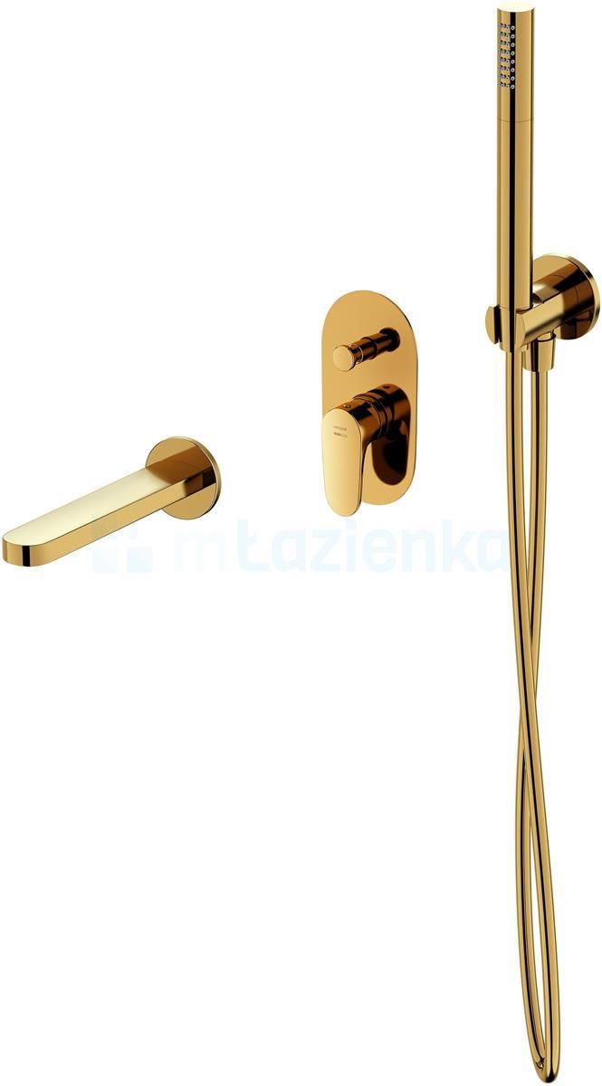Cersanit Inverto zestaw wannowo-natryskowy podtynkowy w kolorze złotym S952-045 Minimalistyczny i nowoczesny styl baterii Inverto idealnie sprawdzi się w łazienkach o takim właśnie charakterze. Bateria podtynkowa wannowo-natryskowa została wyposażona w termostatyczną głowicę ceramiczną , która umożliwia płynną regulację strumienia wody przez cały okres jej eksploatacji. Część podtynkowa armatury to nowoczesne rozwiązanie w formie boksu, który jest łatwy montażu oraz wymianie. Zestaw zawiera 1-funkcyjną rączkę natrysku o średnicy 2,4 cm z silikonowym wykończeniem Cersanit Easy Clean, wąż prysznicowy PCV o długości 150 cm (atest WRAS) oraz wylewkę wannową z perlatorem Cersanit Air. Zestaw posiada chromowane wykończenie powierzchni, które zostało zabezpieczone odporną na ścieranie powłoką PVD. Produkt objęty jest 12-letnią gwarancją na korpus, 3-letnią gwarancją na głowicę termostatyczną i 2-letnią gwarancją na pozostałe elementy zestawu. Zestaw zawiera: baterię (S951-285), zestaw natryskowy z przyłączem kątowym (S951-710), wylewkę wannową (S951-555). Cechy Gwarancja: 12 lat na korpus, 5 lat na głowicę, 2 lata na pozostałe elementy Kolor: Złoty Rodzaj chromowania: PVD Rodzaj głowicy: Ceramiczna Sposób montażu: Podtynkowy Zawartość zestawu Bateria wannowo-natryskowa z elementem podtynkowym w kolorze złotym S951-285 Słuchawka, wąż, przyłącze kątowe z uchwytem w kolorze złotym S951-710 Wylewka wannowa w kolorze złotym S951-555