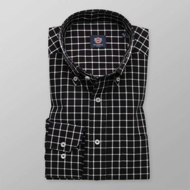 Czarna klasyczna koszula w białą kratę z podpinanym kołnierzykiem i kontrastowymi guzikami