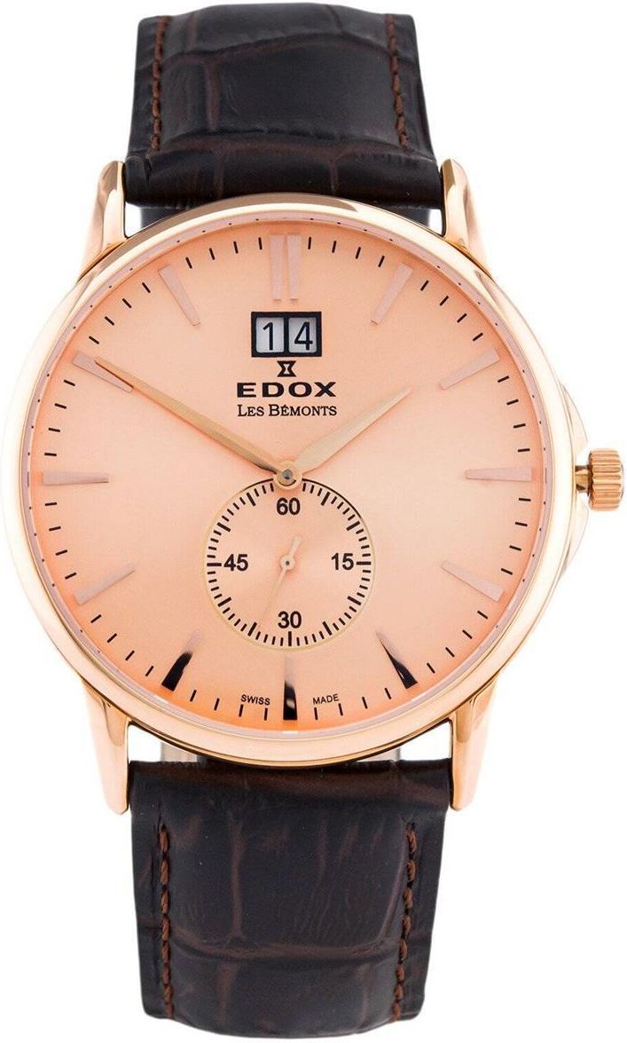 Opis: zegarek męski EDOX 64012 37R ROIR Mechanizm: kwarcowy RONDA 6004.B made in swiss. Datownik: wskaźnik dnia miesiąca. Koperta: wykonana z wysokiej jakości stali szlachetnej, stop ten charakteryzuje się najwyższym stopniem odporności na korozję. Szkiełko: wysokiej jakości szkiełko szafirowe, odporne na zarysowania - płaskie. Pasek: skórzany, wysoka jakość. Wodoszczelność: klasa wodoszczelności - 3ATM. Odporny na deszcz i zachlapania. Kolorystyka koperta: czerwone złoto tarcza: czerwone złoto pasek: ciemnobrązowy Wymiary koperta: szerokość 41mm, wysokość 45mm tarcza: średnica 36mm szerokość paska: 22mm grubość zegarka: 7mm obwód zegarka od 17.5cm do 22.5cm obwód nadgarstka, na którym przedstawiony jest zegarek to 16cm Gwarancja Na zegarek jest udzielana 24 miesięczna gwarancja. DO ZEGARKA DOŁĄCZONE JEST ORYGINALNE PUDEŁKO Cena sklepowa: 2699 zł