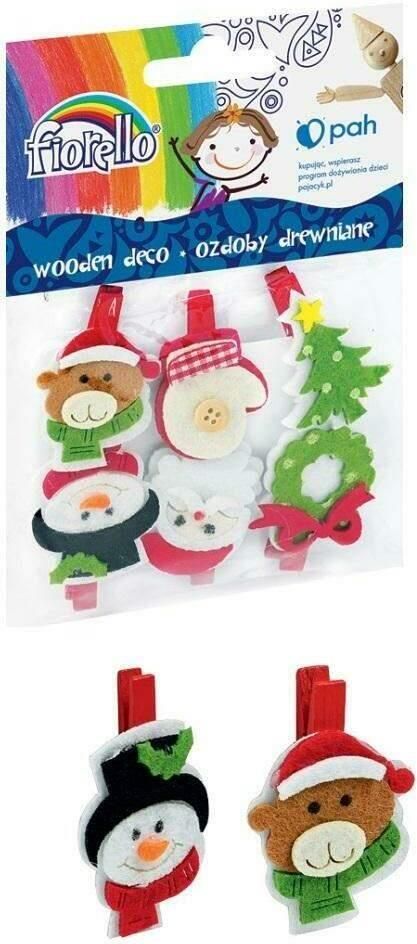Ozdoby drewniane spinacz świąteczne Boże Narodzenie 6 szt. 170-2536Zestaw 6 drewnianych spinaczy z kolorowymi ozdobami idealnie nadaje się do tworzenia klimatycznych dekoracji świątecznych.Spinacze można wykorzystać przy pakowaniu prezentów, ozdabianiu kartek, wieńców czy jako część świątecznych aranżacji wnętrz.Filcowe aplikacje w kształcie świątecznych symboli wprowadzają radosną atmosferę i dodają uroku każdemu projektowi. zestaw zawiera 6 sztuk spinaczymotywy: Mikołaj, bałwan, miś, choinka, rękawica, wieniecmateriał: drewno z filcowymi aplikacjamikolor: naturalne drewno z kolorowymi ozdobamiidealne do dekoracji prezentów, kartek oraz wnętrz