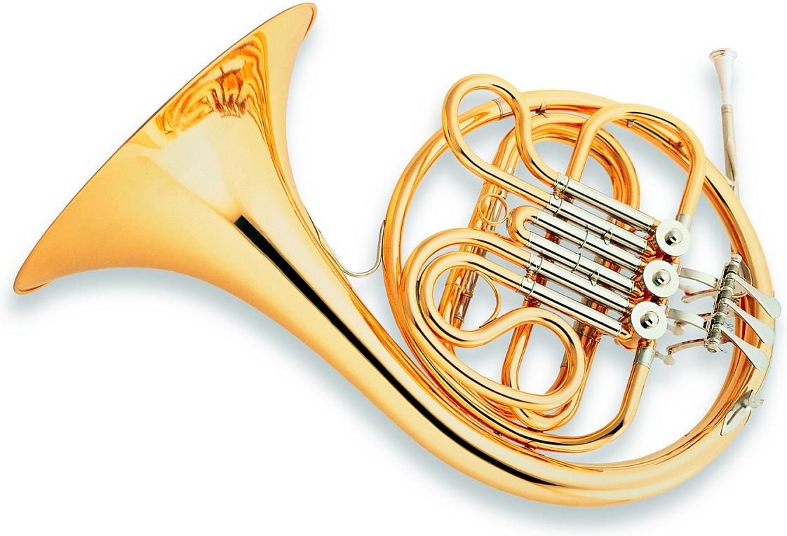 Waltornia pojedyncza F, lakierowana z elementami niklowanymi, rurka główna z różowej blachy, wentyle z blachy utwardzanej fosforem.