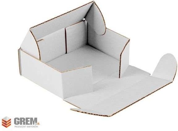 Komplet 10 sztuk obustronnie białych pudeł kartonowych fasonowych o wymiarach zew. 140x100x50 mm (dł/szer/wys). Opakowania wykonane są z trzywarstwowej tektury falistej (fala B) o gramaturze 410 g/m2.