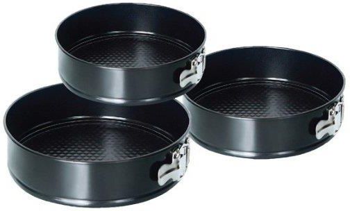 Zestaw okrągłych blach do pieczenia. \nCechy: \n-3 szt okrągłe formy do pieczenia ze stali węglowej,\n-Każda wyposażona w otwierający ściankę boczną zamek,\n-Wnętrza pokryte specjalną wytrzymałą powłoką nieprzywieralną,\n-Zewnętrzne odporne na wysoką temperaturę i korozję,\n-Łatwe w czyszczeniu i …