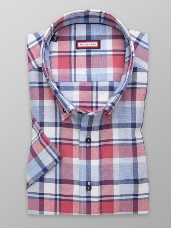 Klasyczna koszula w czerwono-błękitną kratę z podpinanym kołnierzykiem, tkanina z dodatkiem lnu naturalnego