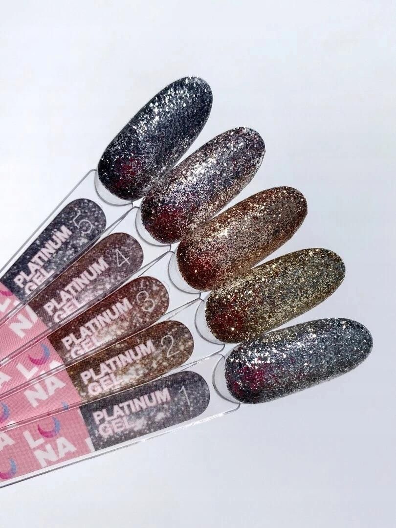 Lunamoon Platinum Gel №4, 5ml Lunamoon Platinum Gel to brokat nasączony różnokolorowym glitterem, idealny do tworzenia zdobień. Jest to miękki materiał, dlatego nie można go używać do przedłużania i wzmacniania paznokci. Dzięki wysokiej jakości pigmentacji, żel z glitterem pozwala na stworzenie idealnego pokrycia płytki paznokcia nawet jedną cienką warstwą. Ma konsystencję średniej gęstości, nie rozlewa się i nie dostaje się pod skórki. Brokat o różnych rozmiarach i kształtach, zawarty w żelu, równomiernie rozprowadza się po powierzchni paznokci, tworząc równą warstwę i nadając im nieskazitelny wygląd. Sposób użycia: Nakładamy podkład Rubber base LUNAmoon. Wykonujemy minimalne wyrównanie bazą/żelem. Nakładamy brokat na standardowo przygotowaną płytkę paznokcia w 1-2 cienkich warstwach, pokrywając całą powierzchnię paznokcia lub częściowo, w zależności od zamierzonego wzoru. Utwardzamy przez 90 sekund. Pokrywamy TOPem LUNAmoon. Suszymy przez 120 sekund. Polecane Produkty