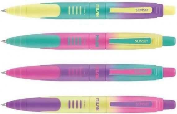 Długopisy niebieski COMPACT z kolekcji SUNSET z obudową w kolorach tęczy. Pstrykane. Przybliżona długość pisania: 1000 metrów. Końcówka 1 mm. Atrament wyprodukowany w Niemczech. Oryginalny produkt stworzony przez własny dział badawczo-rozwojowy MILAN. Rozmiar długopisu: 14,1 x 1,7 cm x 1,4 cm. 4 różne kolory obudowy: żółty, fioletowy, różowy i turkusowy. Uwaga! Cena dotyczy 1 sztuki, wzór wysyłany losowo - brak możliwości wyboru.