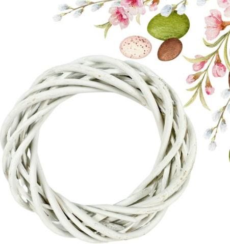 Wianek dekoracyjny świąteczny wiosenny wiklinowy 15cm Cechy produktu: Średnica wianka - zewnętrzna: 15 cm Średnica otworu - wewnętrzna: 9 cm Wysokość: 2,5 cm Typ: wiklinowy Kolor: biały