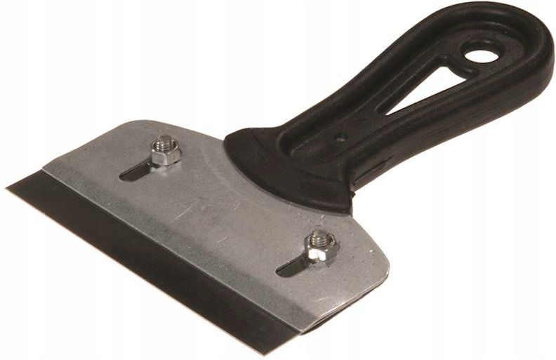 Skrobak Malarski z Wymiennym Ostrzem do Farb i Tynków 100mm Skrobak malarski z wymiennym ostrzem i wygodną rękojeścią z tworzywa sztucznego przeznaczony do usuwania starych powłok malarskich i tapet. Stabilne i bezpieczne mocowanie ostrza przy pomocy wkrętów. szerokość 100 mm ostrze ze stali elastycznej rączka wykonana z plastiku do prac malarsko, budowlanych, remontowych