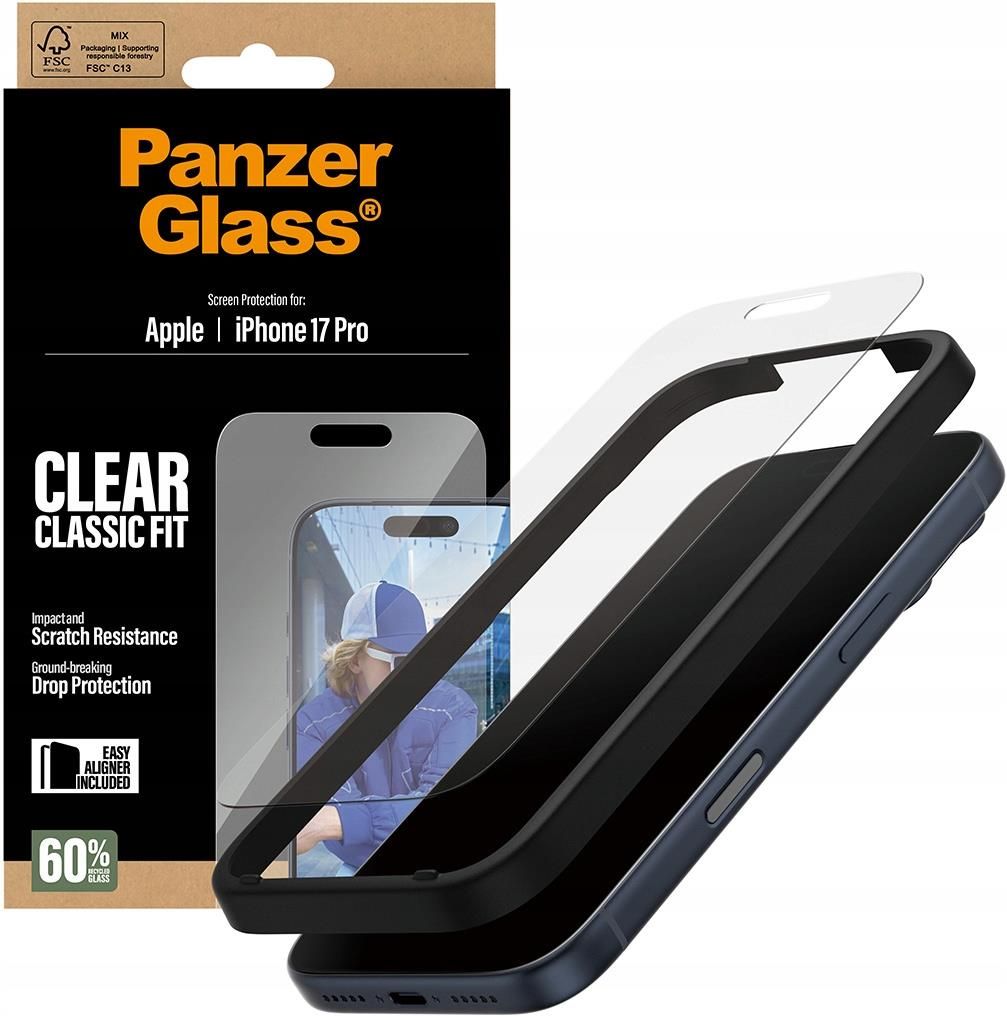 PanzerGlass ® Screen Protector iPhone 17 Pro | Classic Fit w. EasyAligner Przezroczysta ochrona ekranu Apple 1 szt. PanzerGlass ® Screen Protector iPhone 17 Pro | Classic Fit w. EasyAligner. Kompatybilność marki: Apple, Kompatybilność: Apple - iPhone 17 Pro. Aplikacja na sucho. Cechy zabiezpieczeń: Odporny na zadrapania, Odporny na wstrząsy. Materiały: Szkło hartowane, Poli(tereftalan etylenu) (PET), Silikon, Kolor produktu: Przezroczysty. Ilość na paczkę: 1 szt. Najważniejsze parametry techniczne Konstrukcja - Materiały: Szkło hartowane, Poli(tereftalan etylenu) (PET), Silikon Konstrukcja - Rozmiar ekranu (wysokość x szerokość): 145,35 x 67,24 mm Konstrukcja - Cechy zabiezpieczeń: Odporny na zadrapania, Odporny na wstrząsy Wydajność - Aplikacja na sucho: Tak Wydajność - Aplikacja bez bąbelkowa: Tak Wydajność - Łatwy w użyciu: Tak Wydajność - Łatwy do usunięcia: Tak Wydajność - Zaokrąglone krawędzie: Tak Wydajność - Ilość na paczkę: 1 szt. Wyświetlacz - Powłoka oleofobowa: Tak Wyświetlacz - Odporny na odciski palców: Tak Cechy - Protector type: Przezroczysta ochrona ekranu Cechy - Kolor produktu: Przezroczysty Cechy - Kompatybilność marki: Apple Cechy - Łatwy do czyszczenia: Tak Cechy - Typ instalacji: Pełna warstwa adhezyjna Cechy - Kraj pochodzenia: Chiny Cechy - Kompatybilność: Apple - iPhone 17 Pro Waga i rozmiary - Szerokość produktu: 67,2 mm Waga i rozmiary - Głębokość produktu: 0,71 mm Waga i rozmiary - Wysokość produktu: 145,3 mm Waga i rozmiary - Grubość: 0,71 mm Waga i rozmiary - Waga produktu: 13 g Zawartość opakowania - Szmatka do czyszczenia: Tak Zawartość opakowania - Zestaw do czyszczenia: Tak Zawartość opakowania - Sucha chusteczka: Tak Zawartość opakowania - Nawilżona chusteczka: Tak Zawartość opakowania - Tacka instalacyjna: Tak Dane opakowania - Szerokość opakowania: 108 mm Dane opakowania - Głębokość opakowania: 12 mm Dane opakowania - Wysokość opakowania: 195 mm Dane opakowania - Waga wraz z opakowaniem: 51 g Dane opakowania - Rodzaj opakowania: Zawieszane pudełko Dane logistyczne - Kod zharmonizowanego systemu (HS): 7007190000 Klasyfikacja - Kod producenta: PG55915 Klasyfikacja - EAN: 5715685025686 Klasyfikacja - ID Produktu: 132948876