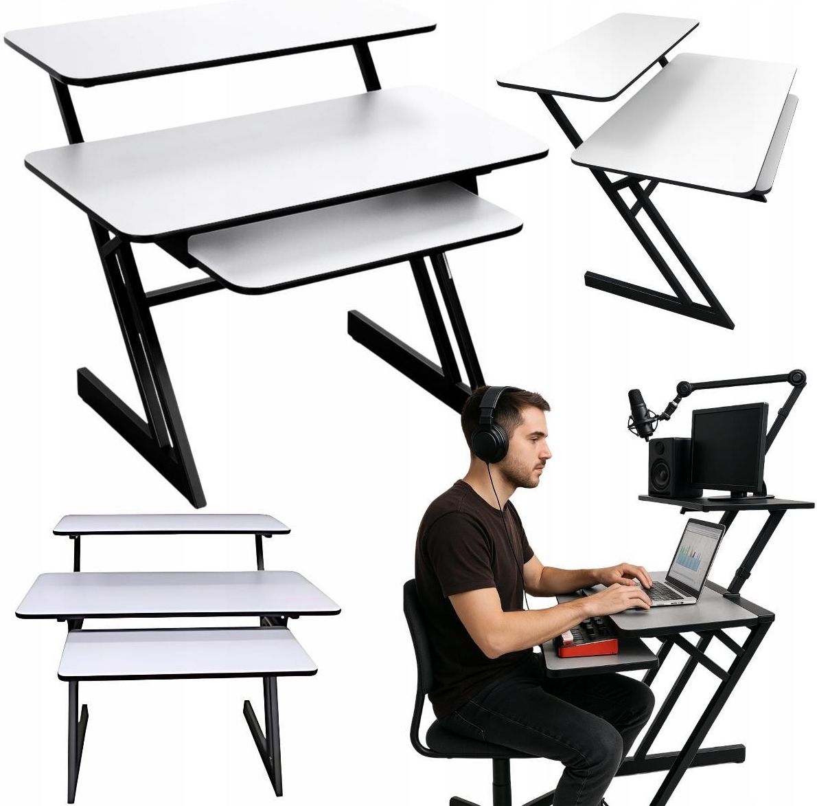 DNA SD3 – biurko studyjne 120×60 cm z półką 98×44 cm i wysuwaną półką 70×36 cm, stalowy stelaż, udźwig 50 kg – kompaktowe centrum dla muzyków, realizatorów i twórców wideo Krótki opis produktu – kompaktowe studio, pełnowymiarowy komfort DNA SD3 to sprytne, trójpoziomowe stanowisko dla pracy z dźwiękiem i obrazem. Łączy stabilny stelaż stalowy malowany proszkowo z blatami MDF w kolorze jasnoszarym, oferując miejsce na kluczowe urządzenia bez zagracania pokoju. Blat 120×60 cm wygodnie mieści interfejs, mikser, kontrolery czy notatki; górna półka 98×44 cm podnosi monitor audio/wideo na ergonomiczną wysokość, a wysuwana półka 70×36 cm ustawia klawiaturę komputerową lub MIDI w naturalnym zasięgu dłoni. Dzięki udźwigowi do 50 kg SD3 radzi sobie z typowym setupem domowego i projektowego studia. Minimalistyczna, kontrastowa estetyka (szary + czarny) pasuje do przestrzeni kreatywnych, a przemyślane proporcje pomagają zachować porządek, przepływ pracy i powtarzalne rezultaty – niezależnie, czy miksujesz, montujesz, nagrywasz podcasty czy streamujesz. Najważniejsze cechy produktu: Kompaktowy blat 120×60 cm – wygoda w małych pomieszczeniach. Górna półka 98×44 cm – ergonomiczne ustawienie monitora/monitorów. Półka wysuwana 70×36 cm – komfortowa klawiatura PC/MIDI pod ręką. Stal malowana proszkowo – stabilność i odporność na zarysowania. MDF jasnoszary – łatwe czyszczenie, nowoczesny wygląd. Udźwig do 50 kg – bezpieczne podparcie sprzętu studyjnego. Trzy poziomy pracy – porządek, ergonomia i szybki dostęp do urządzeń. Wysokości referencyjne – blat 73,5 cm; półka górna 91,4 cm; półka wysuwana 66 cm. Kompaktowy footprint – szerokość stelaża 86 cm, długość nóg 57 cm. SD3 organizuje sprzęt w logicznych strefach: odsłuch u góry, praca i kontrola na blacie, wprowadzanie danych na półce wysuwanej. Efekt to czytelny workflow: krótsza droga ręki do kontrolera, mniej przewijania, mniej przekładania i bardziej przewidywalny odsłuch w codziennej pracy. Ergonomia i trzy poziomy – naturalna postawa, lepsza koncentracja Projekt SD3 oparto na zasadzie trzech horyzontów pracy. Półka górna (98×44 cm, wys. 91,4 cm) utrzymuje ekran lub monitory audio z dala od blatu, dzięki czemu oczy i uszy pozostają w optymalnej osi. Blat 120×60 cm zapewnia wygodną strefę operacyjną dla miksera, interfejsu i kontrolerów; jest na tyle głęboki, by ułożyć dłonie przed klawiaturą bez krawędziowego nacisku. Półka wysuwana 70×36 cm (wys. 66 cm) pozwala na neutralny kąt w nadgarstkach – kluczowy przy długich sesjach. Takie rozmieszczenie skraca ruchy, porządkuje nawyki i pozwala skupić się na decyzjach, a nie na walce z przestrzenią. W praktyce zyskujesz płynniejszą pracę, mniej napięć i lepszą kontrolę nad detalami miksu i montażu. Mały format, duża funkcjonalność – idealne do pokoju i studia projektowego Szerokość 120 cm sprawia, że SD3 mieści się nawet w niewielkich pokojach, a głębokość 60 cm gwarantuje stabilne podparcie dla nadgarstków i miejsce na akcesoria. Szerokość stelaża 86 cm i długość nóg 57 cm ułatwiają wstawienie fotela oraz ustawienie statywu mikrofonowego bez zahaczania o konstrukcję. Minimalistyczny design w kolorach jasnoszary + czarny nie odciąga uwagi od tego, co na ekranie i w głośnikach. Nawet jeśli pracujesz przy ścianie, kompaktowa półka górna pozwala ustawić ekran bliżej linii oczu, a pod spodem zostaje przestrzeń na notatnik, interfejs i kontrolery. To przemyślana baza do montażu wideo, produkcji muzycznej, korepetycji online czy live streamingu – bez rezygnacji z komfortu. Trwałość na lata – stalowa rama i odporne płyty MDF Rama ze stali malowanej proszkowo zapewnia sztywność i stabilność konstrukcji, dzięki czemu biurko nie „pływa” przy energicznej pracy z klawiaturą lub kontrolerem. Powłoka proszkowa lepiej chroni przed zarysowaniami niż klasyczny lakier, a MDF w jasnoszarym kolorze łatwo utrzymać w czystości. Deklarowany udźwig 50 kg oznacza bezpieczne wsparcie dla typowych konfiguracji domowych i projektowych: para monitorów bliskiego pola, ekran, interfejs, kontroler i akcesoria. Krawędzie płyt są gładkie, co podnosi komfort dotyku w długich sesjach i ogranicza zmęczenie rąk. SD3 łączy pragmatyzm z estetyką: wygląda profesjonalnie i tak samo działa – dzień po dniu. Szybki montaż i precyzyjne dopasowanie – start jeszcze dziś W pudełku czeka kompletny zestaw śrub oraz 2 klucze imbusowe, a jasna instrukcja montażu prowadzi krok po kroku: od skręcenia stelaża, przez osadzenie blatów, po regulację położeń półki wysuwanej. Wymiary opakowania 125×70×20 cm ułatwiają wniesienie do mieszkania lub biura, a łączenia są zaprojektowane tak, by elementy do siebie „wpadały” i zachowywały geometrię. Po skręceniu ustawiasz biurko w docelowym miejscu, kalibrujesz odległości względem krzesła i monitorów i… pracujesz. Żadnych niespodzianek, żadnego zgadywania. To niewielka inwestycja czasu, która błyskawicznie procentuje wygodą i porządkiem na stanowisku. Ustawienie odsłuchu – lepsza scena, mniej zaskoczeń w miksie Półka górna pozwala unieść monitory studyjne lub ekran tak, aby linia odsłuchu przebiegała na wysokości uszu, a oś wzroku pozostała równoległa do krawędzi blatu. Dzięki temu mniej męczysz kark, a decyzje dotyczące balansu, panoramy i barwy stają się pewniejsze. Szerokość 98 cm pozwala zachować logiczny rozstaw monitorów bliskiego pola w małych pomieszczeniach; w razie potrzeby podkładki izolujące lub krótkie standy dodatkowo ograniczają przenoszenie drgań na konstrukcję. Głębokość 44 cm stabilnie podpiera kolumny lub ekran, a pod półką pozostaje miejsce na interfejs i kontrolery. SD3 wspiera dobre nawyki – bo dobry odsłuch zaczyna się od poprawnej geometrii stanowiska. Porządek w kablach i wo