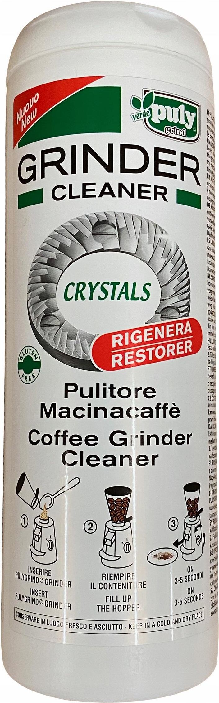 PULY VERDE Grinder Cleaner Crystals proszek do młynka 405g PULY VERDE Grinder Cleaner Crystals to preparat do czyszczenia młynków do kawy, również tych zabudowanych w ekspresach do kawy. Kryształki konserwują oraz regenerują ostrza młynka bez demontażu. NIE wymagają zmiany ustawień mielenia. Po czyszczeniu młynek jest wolny od wszelkich aromatów i zanieczyszczeń. Środek zawiera naturalne składniki spożywcze (bezglutenowe), które są bezpieczne dla człowieka i posiadają wysokie zdolności wchłaniania olejów i tłuszczów. Sposób użycia - Opróżnij pojemnik na kawę. Wsyp jedną dawkę (15g) PULY Grinder Cleaner do pojemnika. - Ponownie uzupełnij pojemnik ziarnami kawy i zmiel ilość potrzebną na przygotowanie 2 filiżanek kawy. - Wyrzuć tak zmieloną kawę z pozostałościami po czyszczeniu. Częstotliwość używania Zaleca się używanie środka PULY VERDE Grinder Cleaner raz na tydzień. Wszystkie nasze produkty są nowe i fabrycznie zapakowane. Oryginalny produkt bezpośrednio z rynku zachodniego. Dane produktu: - 405g środka czyszczącego PULY VERDE Grinder Cleaner Crystals - wystarcza na około 27 aplikacji (15 g na czyszczenie)