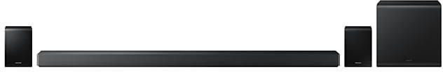 Soundbar Samsung 5.1.2 z Dolby Atmos – zanurz się w kinowym brzmieniu Przenieś kino do własnego salonu i poczuj moc przestrzennego dźwięku. Soundbar Samsung 5.1.2 z wbudowaną technologią Dolby Atmos otoczy Cię dźwiękiem z każdej strony – pięć kanałów głównych, mocny subwoofer oraz dwa głośniki skierowane ku górze sprawiają, że usłyszysz każdy detal tak, jakbyś znalazł się w samym centrum akcji. Rotacyjny design i automatyczna optymalizacja Niezależnie od tego, czy ustawisz soundbar na szafce, czy zamontujesz go na ścianie – czujnik żyroskopowy automatycznie dopasuje ustawienia dźwięku, aby zawsze był idealnie zbalansowany. Mocne basy i krystaliczna czystość Specjalnie zaprojektowany subwoofer zapewnia głębokie, dynamiczne niskie tony, a centralny kanał gwarantuje wyraźne dialogi w filmach, serialach czy transmisjach sportowych. Bezprzewodowe Dolby Atmos i Q-Symphony Zapomnij o plątaninie kabli – soundbar łączy się z telewizorem przez Wi-Fi lub Bluetooth . Funkcja Q-Symphony synchronizuje głośniki telewizora i soundbara, dając potężne, spójne brzmienie. Sztuczna inteligencja analizuje sygnał audio w czasie rzeczywistym i dostarcza maksymalnie realistyczne efekty. Inteligentna adaptacja dźwięku Funkcja Adaptacji Dźwięku automatycznie analizuje odtwarzane treści – od wiadomości, przez sport, aż po dynamiczne filmy akcji – i dostosowuje brzmienie, aby było zawsze perfekcyjne. Tryb Gry Pro – przewaga w grach Uruchamiasz konsolę? Soundbar automatycznie włącza Tryb Gry Pro , zapewniając głębokie basy, przestrzenny efekt dźwiękowy i precyzyjne odwzorowanie każdego detalu. Twoja rozgrywka staje się jeszcze bardziej emocjonująca. Wygoda i nowoczesne technologie Tylne głośniki zapewniają subtelny, kameralny klimat przy niższej głośności. Wbudowana Alexa umożliwia sterowanie głosem. AirPlay 2 pozwala łatwo streamować muzykę z iPhone’a. Jeden Pilot – pełna kontrola nad telewizorem i soundbarem w jednym urządzeniu. Dane podstawowe Liczba kanałów: 5.1 Moc całkowita [W]: 465 Typ subwoofera: Aktywny, Bezprzewodowy Dekodery dźwięku: Dolby Atmos, Dolby Digital, DTS Virtual:X, Surround Sound Expansion Informacje dodatkowe: Airplay 2, Chromecast, HDMI eARC, Możliwość montażu na ścianie, Serwis Spotify, SmartThings App, TIDAL Connect, Tryb gry, Tryb nocny Kolor: Czarny Fizyczne Głębokość jednostki centralnej [mm]: 120 Głębokość subwoofera [mm]: 249 Szerokość jednostki centralnej [mm]: 1160 Szerokość subwoofera [mm]: 249 Waga jednostki centralnej [kg]: 4.4 Waga subwoofera [kg]: 4.8 Wysokość jednostki centralnej [mm]: 51 Wysokość subwoofera [mm]: 252 Waga z opakowaniem [kg]: 16.2 Funkcje Funkcje poprawy dźwięku: Adaptive Sound, Bass Boost, Q-Symphony, Tryb standard, Wzmocnienie dźwięku Łączność bezprzewodowa: Bluetooth Techniczne Dekodery dźwięku: Dolby Atmos, Dolby Digital, DTS Virtual:X, Surround Sound Expansion Informacje dodatkowe: Airplay 2, Chromecast, HDMI eARC, Możliwość montażu na ścianie, Serwis Spotify, SmartThings App, TIDAL Connect, Tryb gry, Tryb nocny Liczba kanałów: 5.1 Odtwarzanie dźwięku: AAC, AIFF, FLAC, MP3, OGG, WAV Pobór mocy [W]: 77 Pobór mocy w trybie gotowości [W]: 1 Zasilanie: 220 - 240 V, 50/60 Hz Złącza Wejście HDMI: 1 Wejście optyczne: 1 Wyjście HDMI: 1 Głośniki Moc całkowita [W]: 465 Typ subwoofera: Aktywny, Bezprzewodowy Wyposażenie: Pilot, Zestaw montażowy Załączona dokumentacja: Instrukcja obsługi w języku polskim, Karta gwarancyjna Gwarancja: 24 miesiące