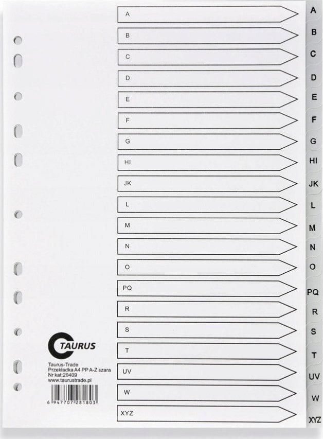 Przekładkinbsp;alfabetyczne TAURUSnbsp; Wykonane znbsp;folii PP o grubości 130g/m2 Karta opisowa Perforacja standardowa (oo otworoacute;w) Kolor biało-szary 1 opakowanienbsp; "Nr oferty xSale TAU254