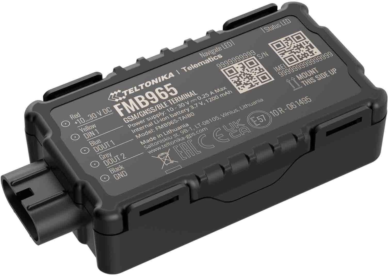 Teltonika FMB965 to mały i inteligentny, wodoodporny tracker z Bluetooth i wewnętrzną baterią zapasową. Tracker o niskim zużyciu energii i dużej pojemności wewnętrznej baterii. Teltonika FMB965 to łatwy w montażu wodoodporny lokalizator z wewnętrznymi antenami GNSS/GSM, pamięcią flash, zintegrowaną baterią podtrzymującą o pojemności 1200 mAh, akcelerometrem, 1x wejściem cyfrowym, 2x wyjściami cyfrowymi oraz różnymi czujnikami łączności BLE 4.0 i sygnalizatorami. Dzięki bogatemu zestawowi funkcji, dużej baterii i obudowie IP67, ten tracker kategorii BASIC zapewnia niekwestionowaną wartość dla dostawców usług telematycznych GPS i użytkowników końcowych. Łatwy w montażu inteligentny lokalizator jest przeznaczony do śledzenia motocykli, SUV-ów, łodzi, skuterów śnieżnych, skuterów wodnych i przyczep, gdzie ważna jest wodoodporna obudowa, duża pojemność wewnętrznego akumulatora i niskie zużycie energii. Najważniejsze cechy: Bluetooth dla urządzeń zewnętrznych i czujników Low Energy Umożliwia pracę urządzenia bez zewnętrznego źródła zasilania Wewnętrzna bateria o dużej pojemności (1200 mAh) Tryb uśpienia przy wyłączonym zasilaniu zmniejsza pobór mocy do mniej niż 1 mA Funkcja wykrywania awarii działająca na podstawie danych akcelerometru Umożliwia odczyt danych magistrali CAN z ECU pojazdu przez Bluetooth Stopień ochrony IP67 Kabel zasilający wejście/wyjście (0,7 m) dołączony do trackera MODUŁNazwa Teltonika FMB965 Technologia GSM/GPRS/GNSS/BLUETOOTH GNSSGNSS GPS, GLONASS, GALILEO, BEIDOU, SBAS, QZSS, DGPS, AGPS Odbiorca 33 kanał Czułość śledzenia -165 dBM Precyzja < 2,5 CEP Dokładność prędkości < 0,1m/s (w granicach błędu +/- 15%) Gorący start < 1 s Ciepły początek < 25 s Chłodny początek < 35 s KOMÓRKOWYTechnologia GSM Pasma 2G Czterozakresowy 850 / 900 / 1800 / 1900 MHz Transfer danych GPRS Multi-Slot klasy 12 (do 240 kb/s), stacja mobilna GPRS klasy B Obsługa danych SMS (tekst/dane) MOCZakres napięcia wejściowego 10 - 30 V DC z zabezpieczeniem przeciwprzepięciowym Bateria zapasowa Akumulator litowo-jonowy 1200 mAh BLUETOOTHSpecyfikacja 4.0 + LE Obsługiwane urządzenia peryferyjne Czujnik temperatury i wilgotności, zestaw słuchawkowy, klucz sprzętowy OBDII, skaner kodów kreskowych Inateck, obsługa uniwersalnych czujników BLE INTERFEJSWejścia cyfrowe 1 Wyjścia cyfrowe 2 Antena GNSS Wewnętrzny wysoki zysk Antena komórkowa Wewnętrzny wysoki zysk USB 2.0 Micro-USB Wskazanie LED 2 diody LED stanu SIM Nano SIM Pamięć Wewnętrzna pamięć flash 128 MB SPECYFIKACJA FIZYCZNAWymiary 79 x 43 x 22 mm (dł. x szer. x wys.) 89 x 43 x 22 mm (dł. x szer. x wys.) (długość z gniazdem przyłączeniowym) Waga 74 gramy ŚRODOWISKO DZIAŁANIATemperatura pracy (bez baterii) -40 °C do +85 °C Temperatura przechowywania (bez baterii) -40 °C do +85 °C Wilgotność pracy 5% do 95% bez kondensacji Stopień ochrony przed wnikaniem IP67 Temperatura ładowania akumulatora 0 °C do +45 °C Temperatura rozładowania akumulatora -20 °C do +60 °C Temperatura przechowywania baterii -20 °C do +35 °C przez 1 miesiąc -20 °C do +30 °C przez 6 miesięcy CECHYCzujniki Akcelerometr Scenariusze Ekologiczna jazda, wykrywanie przekroczenia prędkości, wykrywanie zakłóceń, licznik paliwa GNSS, sterowanie DOUT przez połączenie, wykrywanie nadmiernej pracy na biegu jałowym, wykrywanie odłączania zasilania, wykrywanie holowania, wykrywanie zderzeń, automatyczne ogrodzenie geograficzne, ręczne ogrodzenie geograficzne, podróż Tryby uśpienia GPS Sleep, głęboki sen online, głęboki sen, ultra głęboki sen Konfiguracja i aktualizacja oprogramowania FOTA Web, FOTA, Teltonika Konfigurator (USB, Bluetooth), aplikacja mobilna FMBT (Konfiguracja) SMS Konfiguracja, zdarzenia, kontrola DOUT, debugowanie Polecenia GPRS Konfiguracja, kontrola DOUT, debugowanie Synchronizacja czasu GPS, NITZ, NTP Monitorowanie paliwa Klucz sprzętowy OBDII Wykrywanie zapłonu Wejście cyfrowe 1, akcelerometr, zewnętrzne napięcie zasilania, obroty silnika (klucz OBDII) Wyłącz tryb uśpienia Umożliwia wyłączenie modułu w celu zmniejszenia zużycia energii do mniej niż 1mA w trybie uśpienia CERTYFIKATY I APROBATYRegulacyjne CE-RED, znak E, UKCA, zasięg, RoHS