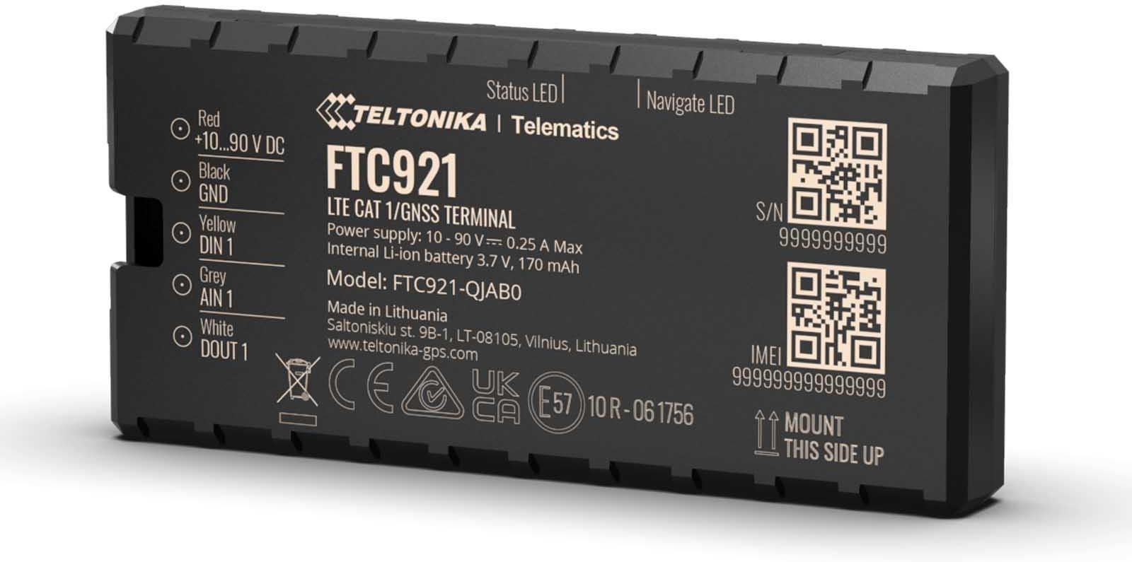 Teltonika FTC921 to mały i inteligentny, wysokonapięciowy samochodowy lokalizator GPS 4G LTE kat. 1 nowej generacji o zwiększonej dokładności GNSS z wewnętrzną baterią zapasową. Platforma Fleet Telematics (FT) obejmuje zarówno nowe standardy rozwoju oprogramowania układowego, jak i nowy sprzęt, zapewniając zwiększoną dokładność śledzenia z wysoką precyzją GNSS, przenosząc doświadczenie śledzenia na wyższy poziom dzięki do 41 widocznym satelitom, umożliwiając znacznie wyższą jakość śledzenia dla usług opartych na lokalizacji. Zoptymalizowane tryby uśpienia pozwalają urządzeniu działać samodzielnie przez dłuższy czas i znacznie zmniejszają zużycie baterii pojazdu, a wysoki poziom zasilania sprawia, że FTC921 jest idealnym rozwiązaniem do monitorowania i śledzenia różnych typów pojazdów, w tym e-motocykli, e-mopedów, e-riksz i innych pojazdów elektrycznych. FTC921 należy do rodziny produktów BASIC, zachowując swoją kompatybilność, niezawodność i wytrzymałość. Wszystkie interfejsy, które posiada, są więcej niż wystarczające do podstawowego śledzenia. Wejście cyfrowe może być używane do monitorowania stanu zapłonu, drzwi lub przycisku alarmowego, podczas gdy zdalne unieruchomienie pojazdu można osiągnąć za pomocą wyjścia cyfrowego urządzenia. Jednocześnie wejście analogowe rozszerza scenariusze użytkowania urządzenia o monitorowanie temperatury, wilgotności, poziomu cieczy i wiele innych. Wszystko to przynosi niekwestionowaną wartość dla wielu segmentów rynku i społeczeństw, budżetów państw i całej globalnej gospodarki. Od teraz może być doskonale dostosowany do każdej floty, każdego transportu i każdej lokalizacji! PLATFORMA FTPlatforma Fleet Telematics (FT) oferuje zaawansowane oprogramowanie sprzętowe i sprzęt, przenosząc śledzenie na wyższy poziom. WYŻSZA DOKŁADNOŚĆ GNSSBardziej precyzyjny GNSS z maksymalnie 41 widocznymi satelitami, umożliwiający znacznie wyższą jakość śledzenia dla usług opartych na lokalizacji. DŁUŻSZA WYDAJNOŚĆ, WOLNIEJSZE ROZŁADOWYWANIEZoptymalizowane tryby uśpienia pozwalają urządzeniu działać samodzielnie przez dłuższy czas i znacznie zmniejszają zużycie baterii pojazdu. ZASILANIE WYSOKONAPIĘCIOWE Rozszerzona wszechstronność integracji dla bezproblemowego wykorzystania w motocyklach elektrycznych, motorowerach elektrycznych, rikszach elektrycznych i innych pojazdach elektrycznych. Najważniejsze cechy: Platforma Fleet Telematics (FT) Wyższa dokładność GNSS Dłuższa wydajność, wolniejsze rozładowywanie Zasilanie wysokonapięciowe Product Model name: FTC921-QJAB0 GNSS GNSS: GPS, GLONASS, GALILEO, BEIDOU Receive type: 135 tracking/acquisition channels Tracking sensitivity: -165 dBM Position Accuracy: < 1.8 m CEP Velocity Accuracy: < 0.1 m/s (within +/- 15% error) Cellular 2G bands: GSM: B2/B3/B5/B8 4G LTE bands: LTE FDD (CAT 1): B1/B3/B5/B7/B8/B20/B28 Data transfer: LTE FDD (CAT 1): Max. 10 Mbps (DL) / Max. 5 Mbps (UL), GSM (GPRS): Max. 85.6 Kbps (DL) / Max. 85.6 Kbps (UL) Transmit power: Class 5 for GSM850/900: 30±5dBM, Class 3 for GSM1800/1900: 29±5dBM, Class 3 for LTE-FDD: 26±5dBM Data support: SMS (TEXT, PDU), Network protocols (TCP) Data codec Codec support: Codec 8 Extended Power Input voltage range: 10–90 V Internal Back-up battery: 170 mAh Li-Ion battery, 3.7 V (0.63 Wh) Internal fuse: 3A, 125V Power consumption: TBA, At 12V < 25 mA (nominal with no load), At 12V < 0.25A Max (with full Load/Peak) Physical specification Dimensions: 93 x 43 x 12.5 mm (L x W x H) Weight: 65 g Operating environment Operating temperature (without battery): -40 °C to +85 °C Storage temperature (without battery): -40 °C to +85 °C Operating temperature (with battery): 0 °C to +40 °C Storage temperature (with battery): -20 °C to +60 °C Operating humidity: 65 ± 20% non-condensing Ingress Protection Rating: IP41 Battery charge temperature: 0 °C to +45 °C Battery discharge temperature: -20 °C to +60 °C Battery storage conditions: 65 ± 20%RH, -20 °C to +25 °C for 3 or more months Interface Digital Inputs: 1 Digital Outputs: 1 Analog Inputs: 1 GNSS antenna: Internal High Gain Cellular antenna: Internal GSM High Gain USB: USB 2.0 USB Type-C LED indication: 2 status LED lights SIM: Nano-SIM Memory: 128MB internal flash memory Features Sensors: Accelerometer Scenarios: Over Speeding detection, Jamming detection, Unplug detection, Trip Configuration and firmware update: FOTA Web, Teltonika Configurator (TCT) SMS: Configuration, Events, Debug GPRS commands: Configuration, Debug Time Synchronization: GNSS, NITZ, NTP Ignition detection: Digital Input 1, Accelerometer, External Power Voltage Certification & approvals Regulatory: FTC921-QJAB0: CE/RED, E-Mark, RCM*, RoHS, REACH, Pulse 5b