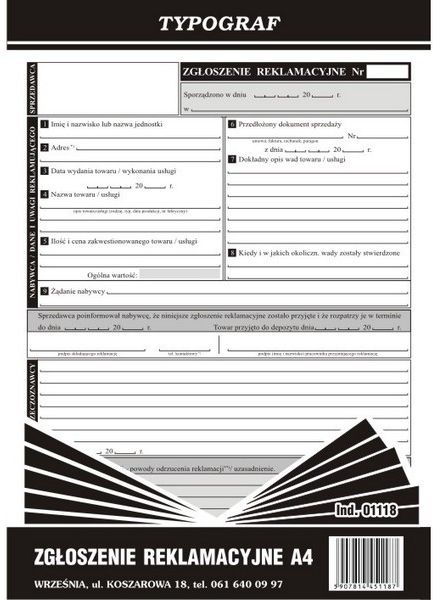 Typograf Druk Zgłoszenie Reklamacyjne A4 1118 Pyskowice