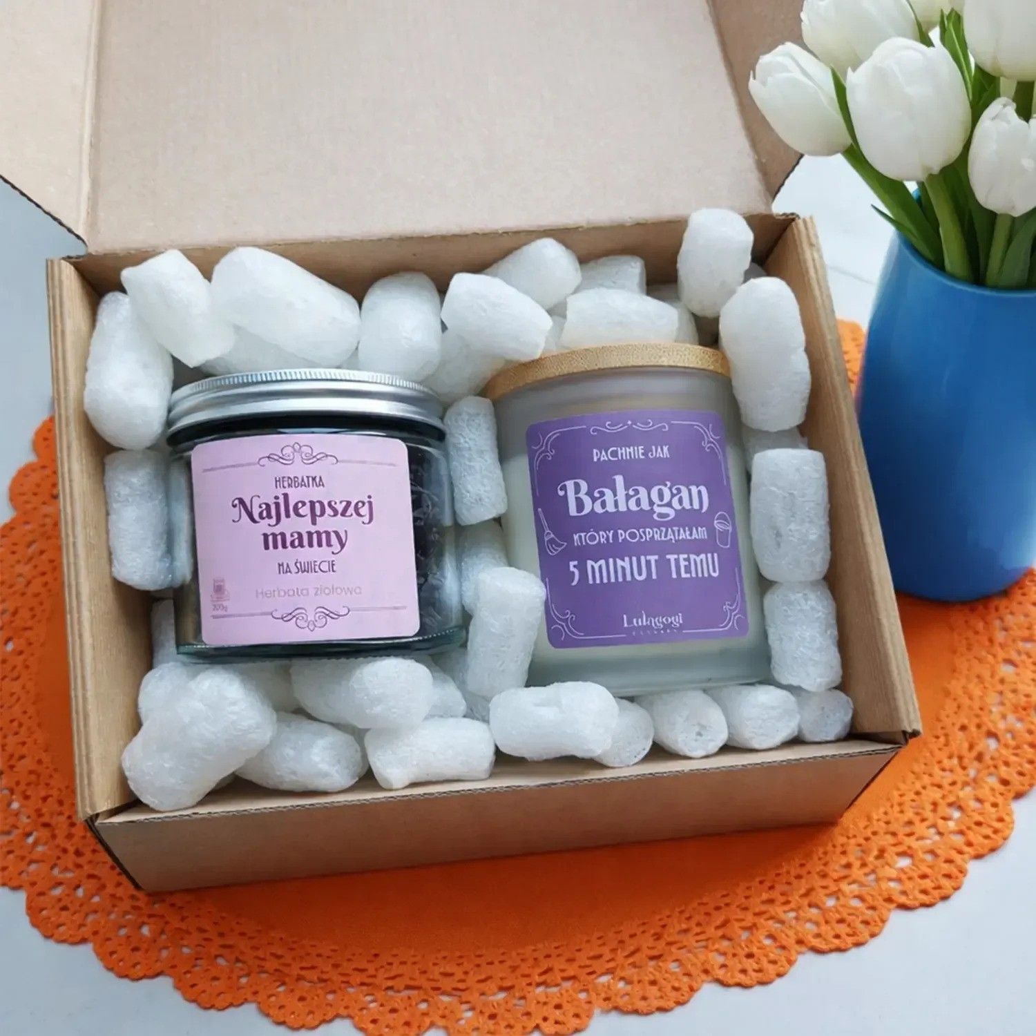 Szukasz wyjątkowego prezentu dla mamy? Ten zestaw to idealne połączenie humoru, ciepła i chwili relaksu. Starannie skomponowany komplet sprawi, że każda mama poczuje się doceniona – a przy okazji może się uśmiechnąć. Całość zapakowana jest w eleganckie pudełko prezentowe wypełnione dekoracyjnym wypełniaczem, dzięki czemu zestaw wygląda pięknie już po otwarciu i jest gotowy do wręczenia bez dodatkowego pakowania. W zestawie znajduje się: Świeca zapachowa z napisem: Pachnie jak bałagan, który posprzątałam 5 minut temu Herbata z napisem:Herbatka najlepszej mamy na świecie Piękne opakowanie Wszystkie elementy zestawu umieszczone są w estetycznym pudełku prezentowym z naturalnej tektury, wypełnionym dekoracyjnym wypełniaczem. Całość tworzy elegancki i gotowy do wręczenia prezent.