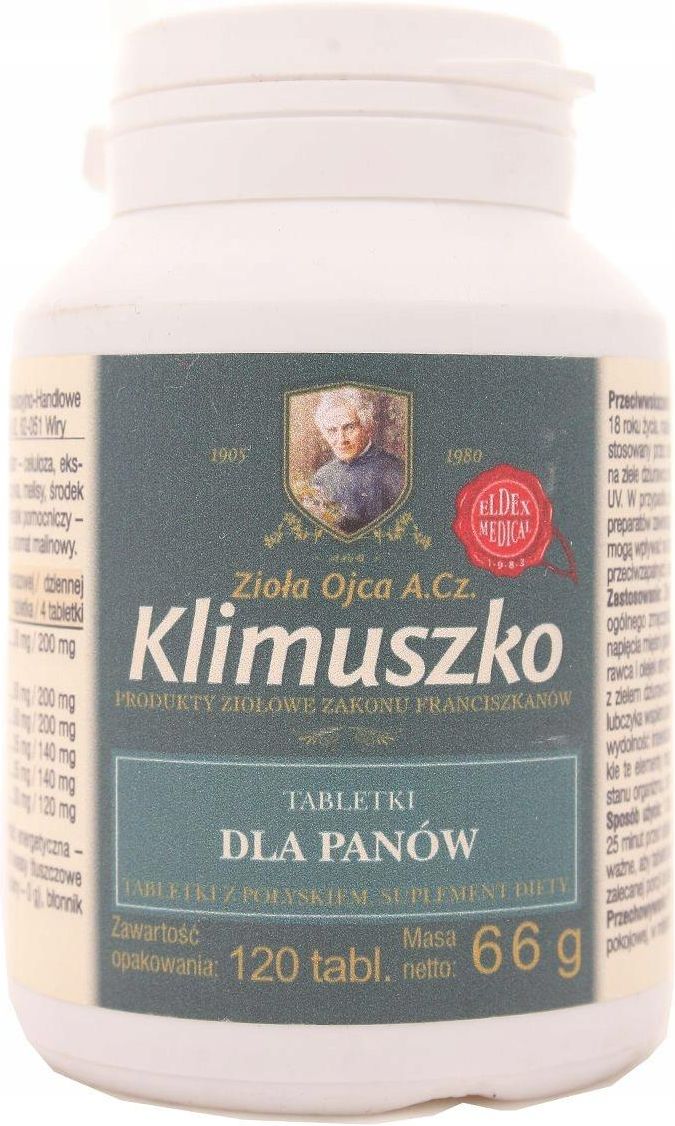 SUPLEMENT DIETY Tabletki dla Panów - Zioła Ojca A.Cz. Klimuszko 120 tabletek Suplement diety działający wspomagająco, przeznaczony dla osób dorosłych, u których występują niepełne lub zanikające erekcje, o podłożu psychogennym lub nerwicowym. _________________________________________________________________________ Składniki w porcji dziennej (1 tabletka) Sproszkowany, wysuszony liść miłorzębu / 50 mg Ekstrakty wodne z: kwiatu nagietka / 50 mg ziela jemioły / 50 mg ziela dziurawca / 35 mg korzenia lubczyka / 35 mg ziela melisy / 30 mg _________________________________________________________________________ Składniki: Sproszkowany liść miłorzębu, emulgator - celuloza, ekstrakty wodne z: nagietka, jemioły, dziurawca, lubczyka, melisy, środek żelujący - sól sodowa karboksymetylocelulozy, środek pomocniczy - ditlenek krzemu, emulgator - stearynian magnezu, aromat malinowy. Sposób użycia: 1 tabletka 20-25 minut przed śniadaniem, 2 tabletki przed obiadem oraz 1 tabletka przed kolacją, popijać szklanką (200 ml) ciepłego napoju. Nie przekraczać dawki 4 tabletek w ciągu doby. Preparat nie może być stosowany jako substytut diety. Przechowywać w suchym miejscu, w temperaturze pokojowej, chronić od światła, w miejscu niedostępnym dla dzieci. Przeciwskazania: Nie stosować u małych dzieci (do 12 roku życia), matek karmiących i kobiet w ciąży. Jakość produktów oraz standardy produkcji zostały poparte min. przez Good Manufacturing Practice Dobra Praktyka Wytwarzania (ang. Good Manufacturing Practice, GMP) – standard GMP zapewnia wysoką jakość, czystość użytych surowców i komponentów gotowego produktu. Jest to gwarancja pełnej kontroli nad jakością i pochodzeniem surowców. Stosowanie standardów GMP przez nasza firmę daje wszystkim konsumentom większy poziom komfortu i pewności co do wysokiej jakości produktu System HACCP Wysoka jakość produktów może byc potwierdzona między innymi poprzez warunki w których nasze kuracje są wytwarzane. System HACCP pozwala na uzyskanie pewności, że zakład wykonuje wszystko dla bezpieczeństwa wyrobu i konsumenta, w odniesieniu do przepisów prawa, zasad dobrej praktyki produkcyjnej i potrzeb klientów. Zaufanie poparte Oskarem "Serce za serce" Wśród laureatów za rok 2005 tej zaszczytnej nagrody znalazła się Zielarnia Ojca A.Cz.Klimuszko - PPH "Eldex-Medical". W sobotni wieczór 10 grudnia, w pięknej sali koncertowej, statuetkę Oskara "Serce za serce" z rąk Ministra Zdrowia prof. Zbigniewa Religi odebrał Leszek Dudarski. Powiedział on między innymi : "Znaczenie słowa zaszczyt, znamy w zasadzie wszyscy, Fundacja założona przez Profesora Religę kojarzy nam się z sercem, które odzwierciedla najlepsze uczucia ludzkie. Firma działająca pod partonatem Ojca A.Cz.Klimuszko powinna choć w części drobnej być także w ten sposób kojarzona i dlatego będziemy nadal - tak jak to czyniliśmy do tej pory - wspierać działania Fundacji". Wiarygodność poparta licencją oo. Franciszkanów Unikalny skład, oryginalność receptura oraz zaufanie jakim cieszą się kuracje Ojca A.Cz. Klimuszko, zostały poparte przez zakon oo. Franciszkanów. Tym samym preparaty ziołowe produkowane w laboratoriach Eldex Medical są jednymi na świecie, oryginalnymi kuracjami Ojca A.Cz. Klimuszko. Opakowanie: 120 tabletek Producent: EM Food & PHARMA PRODUCTION Ojciec Klimuszko, znany na całym świecie ze swych nadzwyczajnych zdolności, rozsławił miasto i klasztor, w którym mieszkał. Setki ludzi przyjeżdżało do niego po poradę zielarską i zdrowotną. Ojciec Andrzej służył pomocą wielu ludziom. Pozostawił po sobie przepisy na mieszanki ziołowe, które są skuteczną pomocą w niemal 130 chorobach. Skuteczność ziół potwierdziły badania lekarskie.