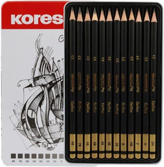 Kores graphite pencil for drawing and sketching. The set includes 12 graphite pencils: 8B, 7B, 6B, 5B, 4B, 3B, 2B, B, HB, F, H and 2H.