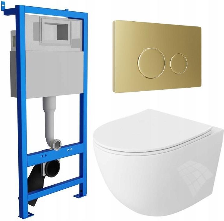 Stelaż podtynkowy LAVITA 50x110 miska WC SINTO 2.0 wirowa + złoty przycisk LAV100^LT-046E-UQ^LAV 200.4.5 Poznaj lepiej stelaż podtynkowy LAV100 Stelaż LAV 100 przeznaczony jest do podtynkowego montażu miski wiszącej. Szerokość produktu to 510mm. Stelaż posiada bogate wyposażenie: ramę stalową, komplet elementów przyłączeniowych, zestaw śrub i wkrętów do montażu, regulowane nóżki z możliwością wysunięcia do 160mm, króciec przyłączeniowy do WC oraz matę wygłuszającą. Dzięki temu kompletnemu zestawowi instalacja stelaża LAV 100 jest niezwykle szybka i bezproblemowa. Szeroka gama przycisków dostępnych w naszej ofercie, pozwoli stworzyć i podkreślić wyjątkowy design Twojej łazienki. Stelaż LAV 100 został wykonany z najlepszej jakości materiałów oraz posiada niezawodny system spłukiwania. Kontrola produkcji stelaży oraz wyjątkowa dbałość o każdy detal pozwoliła stworzyć nam niezwykle wytrzymały, stabilny i odporny produkt. Stelaż podtynkowy pozwoli zaoszczędzić przestrzeń w łazience, wizualnie powiększyć wnętrze, lecz przede wszystkim nadać mu niepowtarzalny look. Specyfikacja techniczna Szerokość: 510mm Głębokość: 150-230mm Wysokość: 1105-1265mm Rozstaw śrub: 180/230mm Materiał ramy: stal nierdzewna Rama malowana proszkowo, odporna na korozję Typ zbiornika: jednoczęściowy Zbiornik wykonany z polipropylenu odpornego na naprężenia termincze Zbiornik z powłoką antykondensacyjną Rysunek techniczny - sprawdź czy stelaż będzie pasować do Twojej łazienki Wszystko co musisz wiedzieć o misce Przedstawiamy Państwu innowacyjną miskę wiszącą Sinto 2.0 producenta Lavita. Miska składa się z samych rewolucyjnych rozwiązań takich jak system cichego, wirowego spłukiwania czy konstrukcja bezrantowa - zapewniająca najwyższy poziom higieny i łatwe czyszczenie miski. Sinto 2.0 to nowoczesny design i świetna jakość na lata. Miska wisząca, bezrantowa Miska ceramiczna Deska z wytrzymałego materiału - duroplastu Deska wypinana, wolnoopadająca, zawiasy metalowe System cichego spłukiwania wirowego Elegancki, nowoczesny design Specyfikacja techniczna Długość: 49 cm Szerokość: 36,5 cm Wysokość: 39,5 cm Rozstaw zawiasów: 18,5 cm Rysunek techniczny - sprawdź czy miska będzie pasować do Twojej łazienki Przycisk sterujący Nowoczesny i elegancki przycisk LAV 200.4.5 w złotym wykończeniu to stylowy akcent Twojej łazienki, łączący prostokątną konstrukcję z połyskującymi, okrągłymi włącznikami. Idealnie komponuje się z ceramiką, pasując do nowoczesnych, skandynawskich i klasycznych aranżacji. Dzięki dwómtrybomspłukiwania (pełnemu i oszczędnemu) zapewnia funkcjonalność i ekologiczne oszczędzanie wody. Wykonany z wytrzymałego ABS, jest odporny na zarysowania i odbarwienia, gwarantując trwałość na lata. Chcesz zmienić przycisk? A może wolisz inną miskę? Bez obaw! W naszej ofercie znajdziesz zestawy z różnymi wariantami produktów. Sprawdź i znajdź swoje wymarzone połączenie!